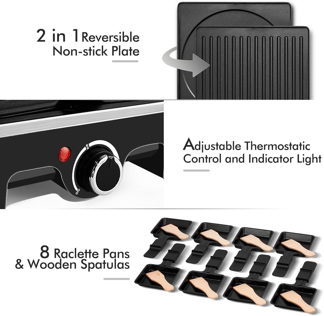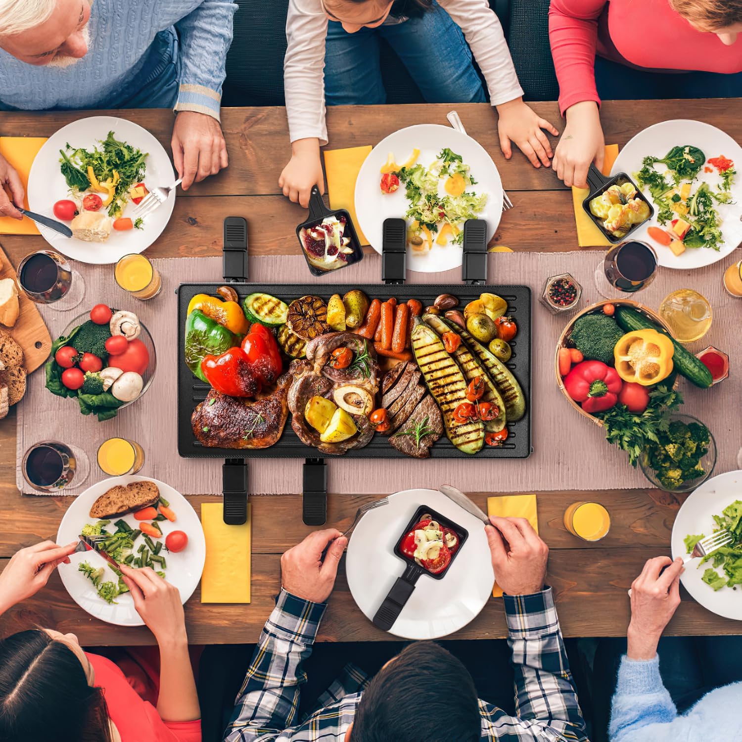- 8 Independent Raclette Trays - Equipped with 8 heat-resistant raclette trays, this cheese raclette can prepare cheese dishes for 8 persons at the same time. It can be used to make raclette cheese, eggs, vegetables, desserts and more, or to keep food warm. The non-stick coating makes it easier to handle food removal and cleaning.