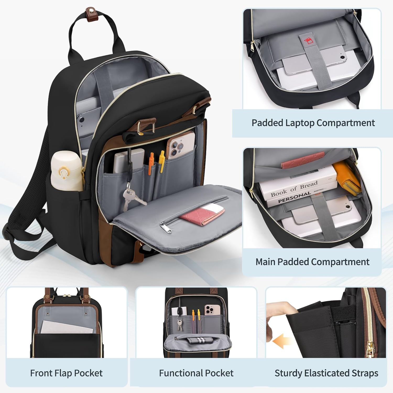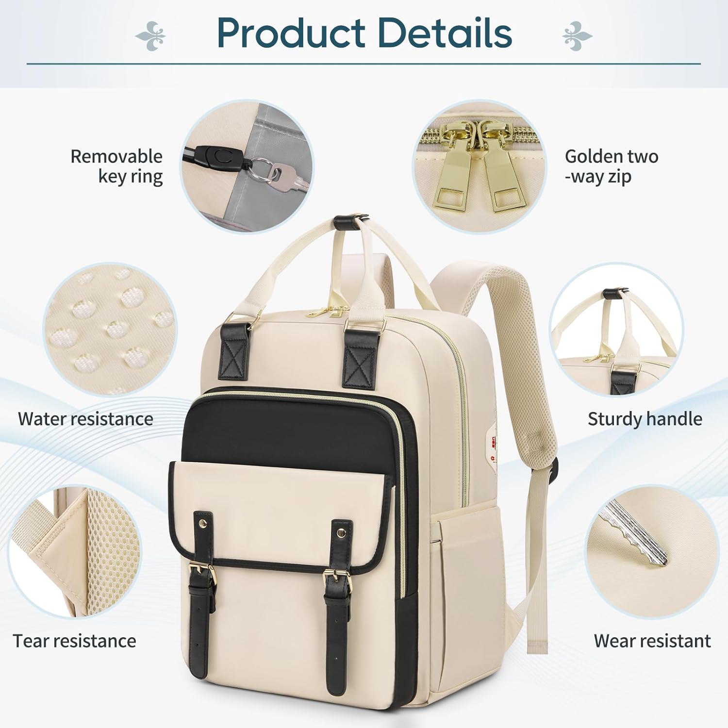 DURABLE MATERIAL: Made from quality polyester and PU leather, this laptop backpack for women is water resistant, scratch-resistant, and tear-resistant. Smooth metal zippers and reinforced top handles ensure long-lasting durability. All stress points of the laptop backpack are specially reinforced to ensure that they do not break when carrying heavy loads