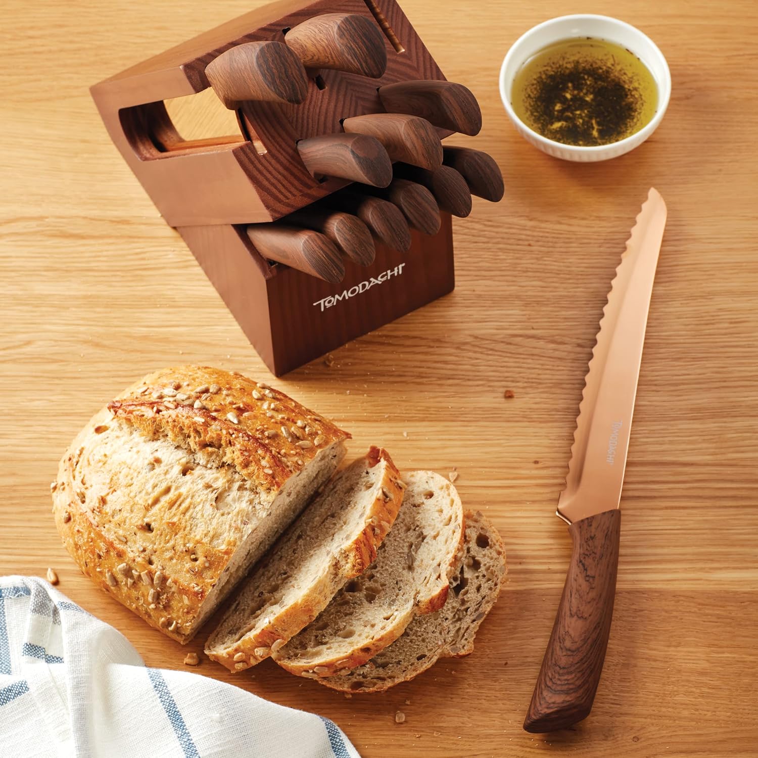 Includes (1) 8" chef knife, (1) 8" bread knife, (1) 8" slicer, (1) 5" utility knife, (6) 4.5"steak knives, (1) 3.5" paring knife, (1) 3" birds beak knife, and (1) wooden cutlery block
