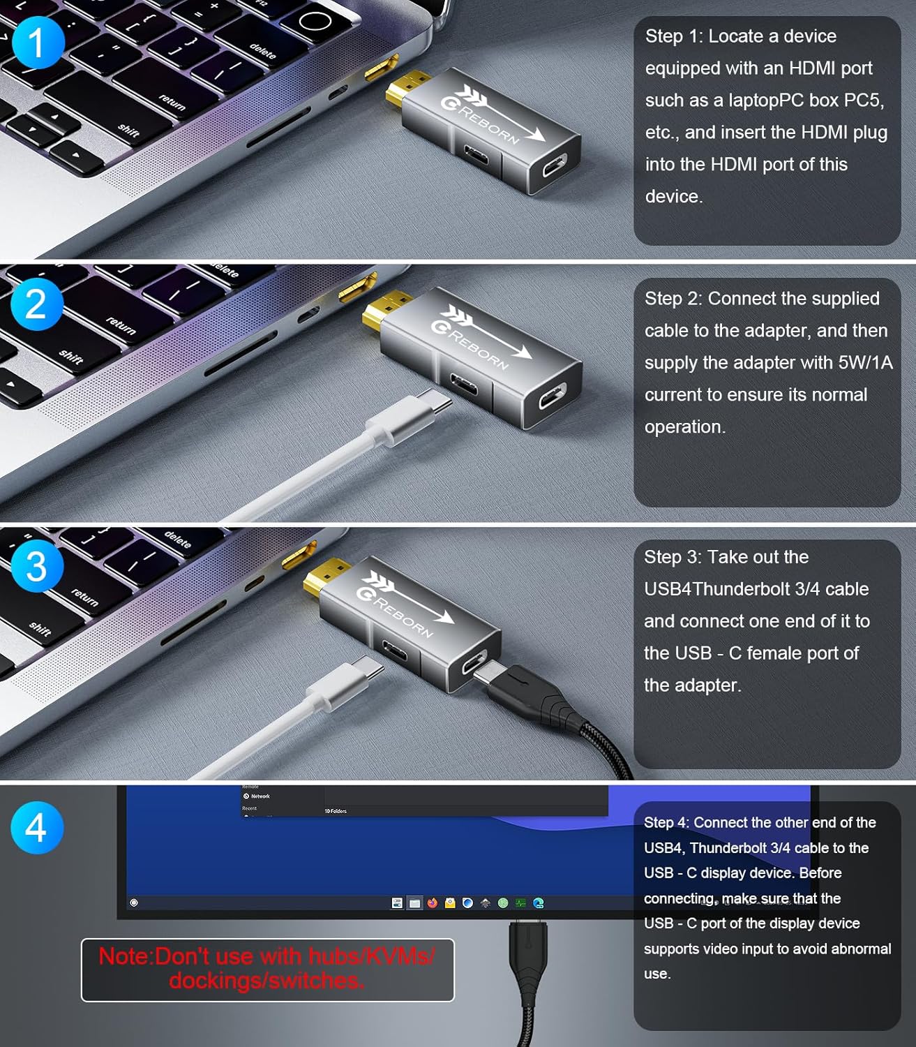 【Operating Mechanism】This HDMI to USB-C adapter can only transfer signals from HDMI devices to USB-C display devices. Plug the HDMI male connector into devices with an HDMI port, such as laptops, PS5, Xbox, TV boxes. Then, use a USB-C cable meeting USB4, Thunderbolt 3/4/5 standards to connect the USB-C female connector of the adapter to devices like monitors. Be sure to connect to a USB power supply for better display. Also, the USB port only powers the adapter and cannot charge devices or displays.【Note:Don't use with hubs/KVMs/dockings/switches】