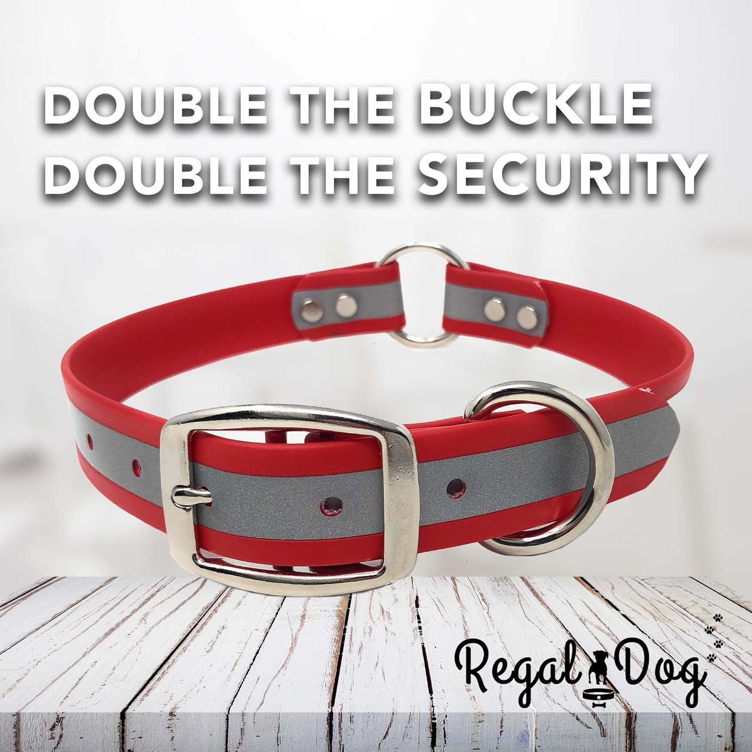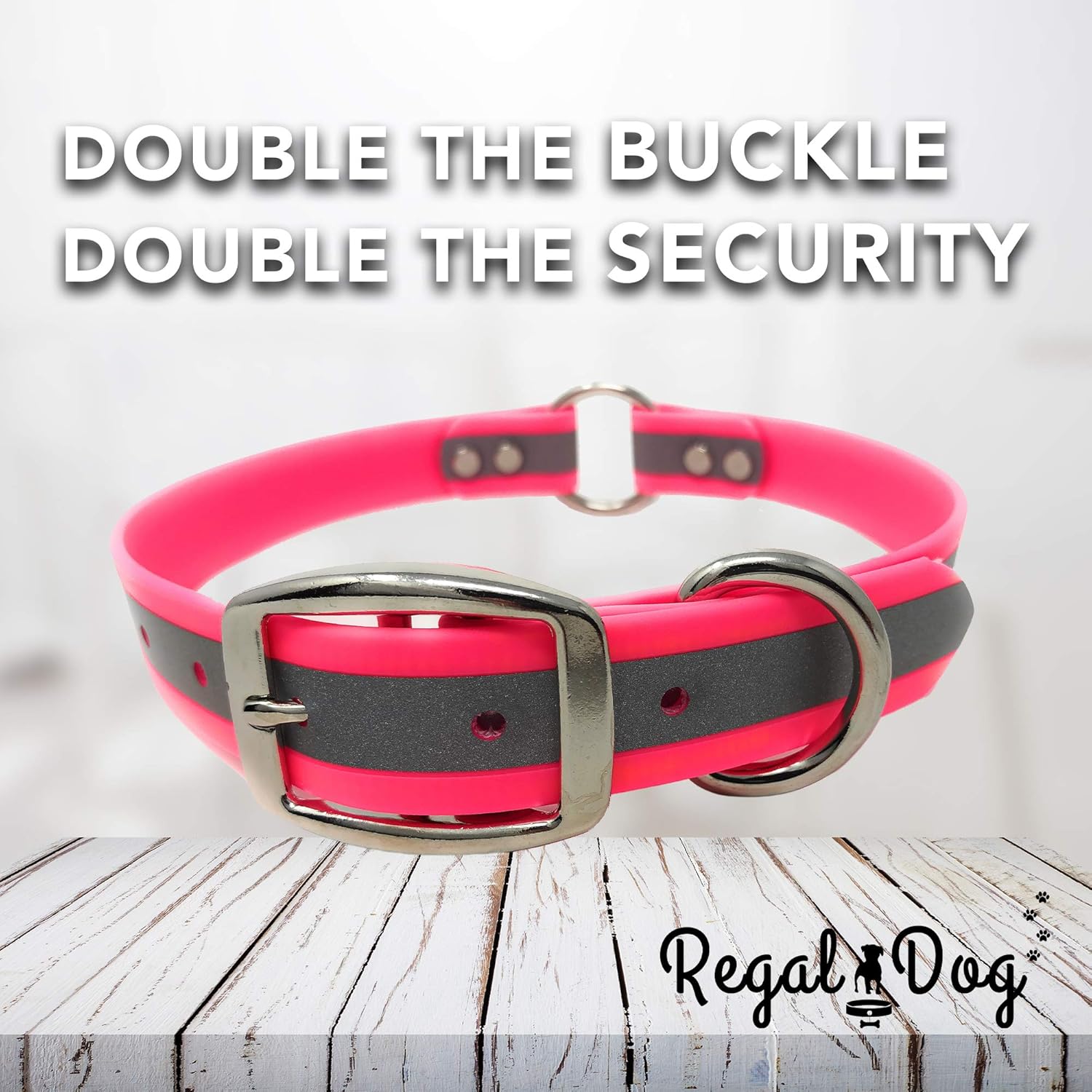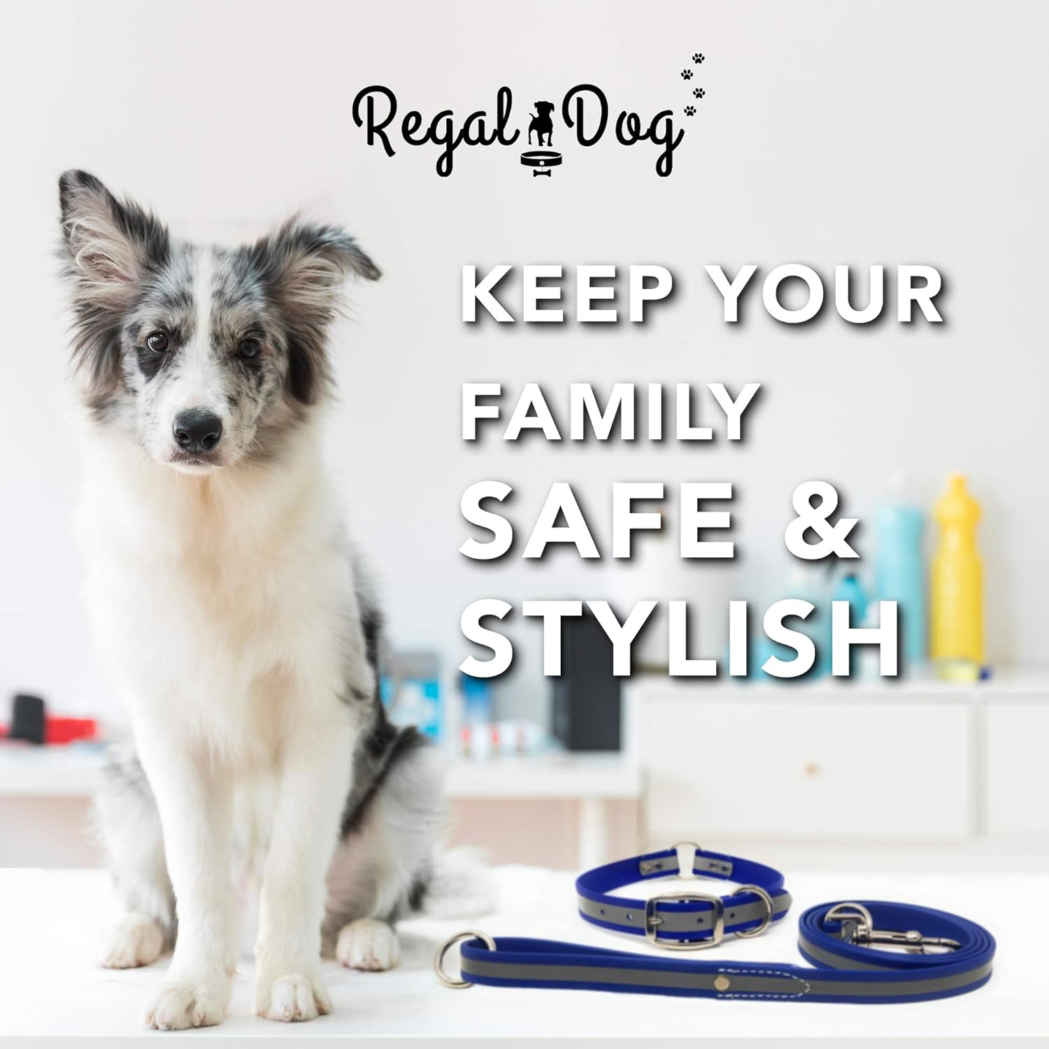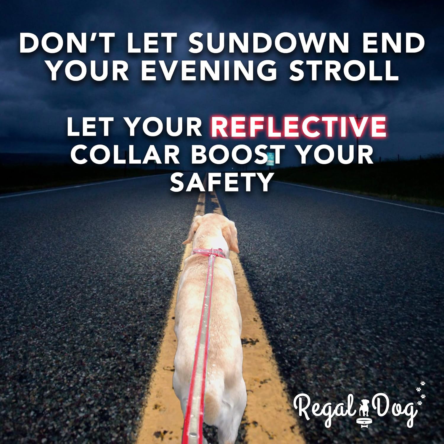 • ๐—ฆ๐—”๐—™๐—˜๐—ง๐—ฌ ๐—”๐—™๐—ง๐—˜๐—ฅ ๐—ฆ๐—จ๐—ก๐——๐—ข๐—ช๐—ก - Walking your dog in the dark is dangerous. Fetch some safety for both you and your furry friend with the Waterproof Reflective Dog Collar by Regal Dog Products! As cars pass, the highly reflective strip notifies drivers of your presence so they can safely steer clear. Keep your dog visible and out of harm's way wherever you may go on your day or night walk.ย