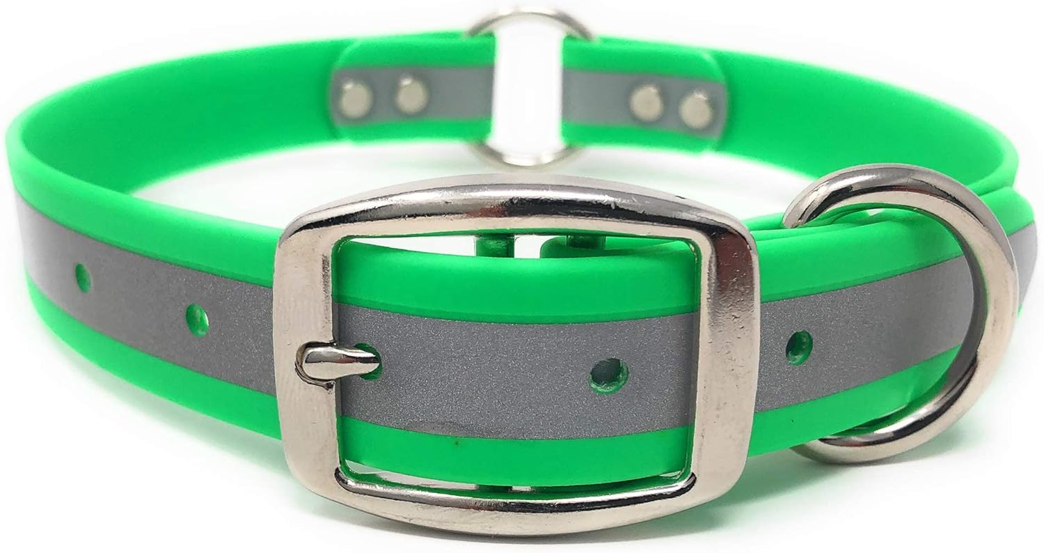 • ๐—จ๐—ก๐—–๐—”๐—ง๐—–๐—› ๐—ฌ๐—ข๐—จ๐—ฅ ๐—–๐—”๐—ก๐—œ๐—ก๐—˜ - Not only does the reflective strip on the reflective dog collar keep your pet safe, but so does the innovative center ring! If your dog gets caught on a fence or branch, the center ring allows your dog to relieve pressure from their throat until rescue can arrive. It also serves as a handy spot to attach your matching leash or harness. Our waterproof collar comes in three sizes that would fit a puppy all the way to a big or extra large dog.