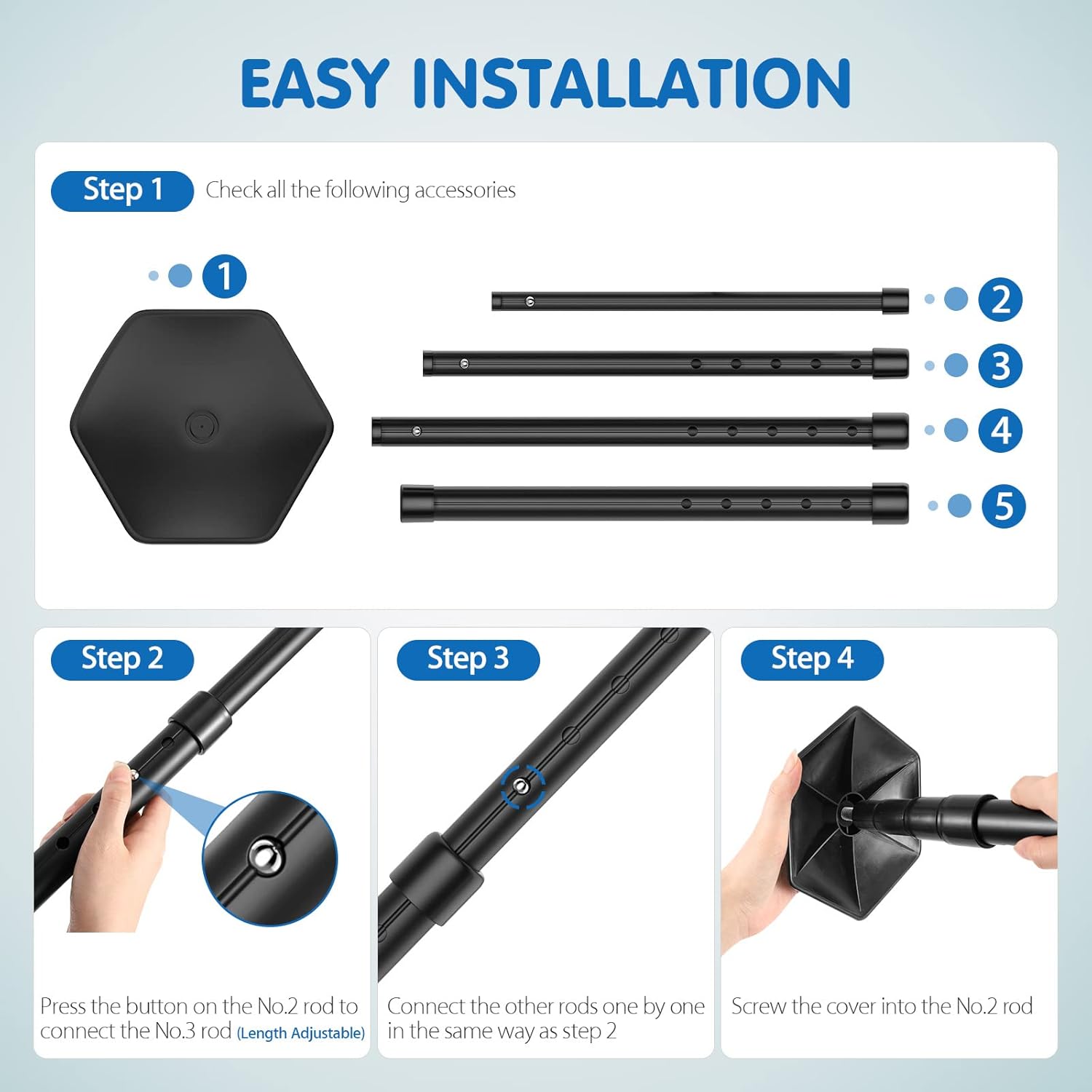 - Included: 4 support pole sections, hexagonal cover, storage bag