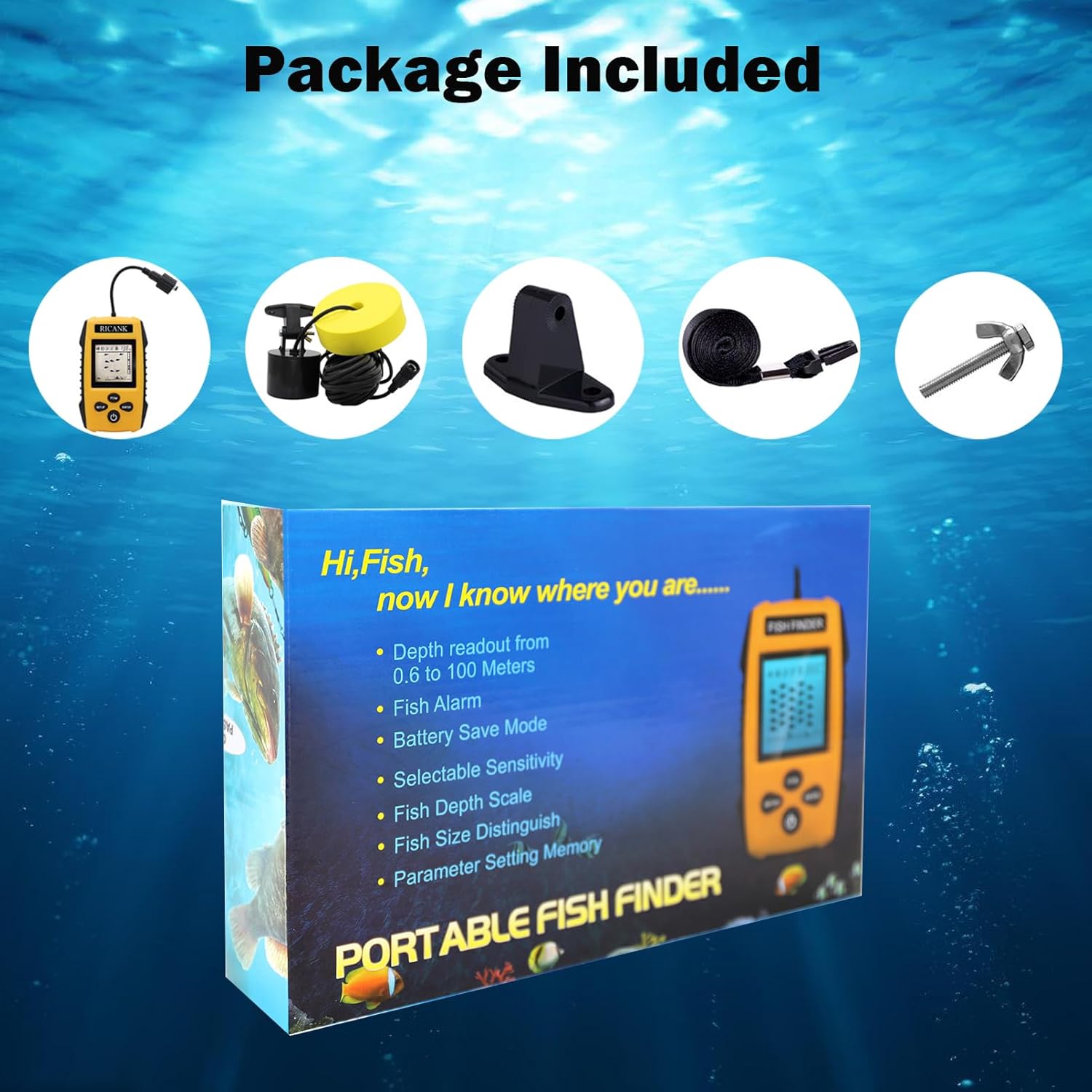 • Package Included:1. Fish Finder Display 2. Sonar Sensor (Transducer) with 25ft cable 3. Removable Transducer Float with Rubber Stopper 4.Transducer Side-Scan Adapter 5. Stainless Bolt and Wing Nut 6.Neck Strap 7.Operation Manual.
