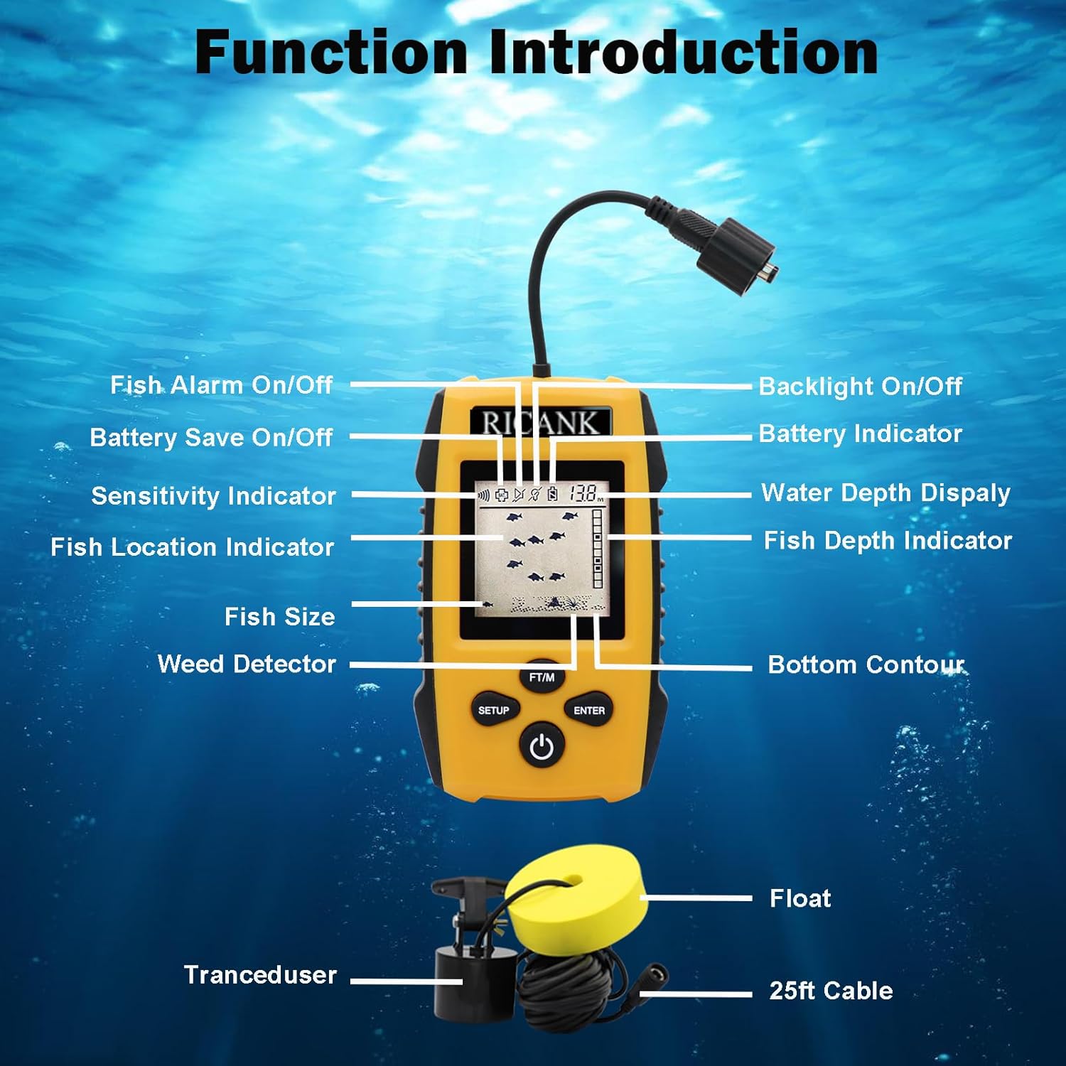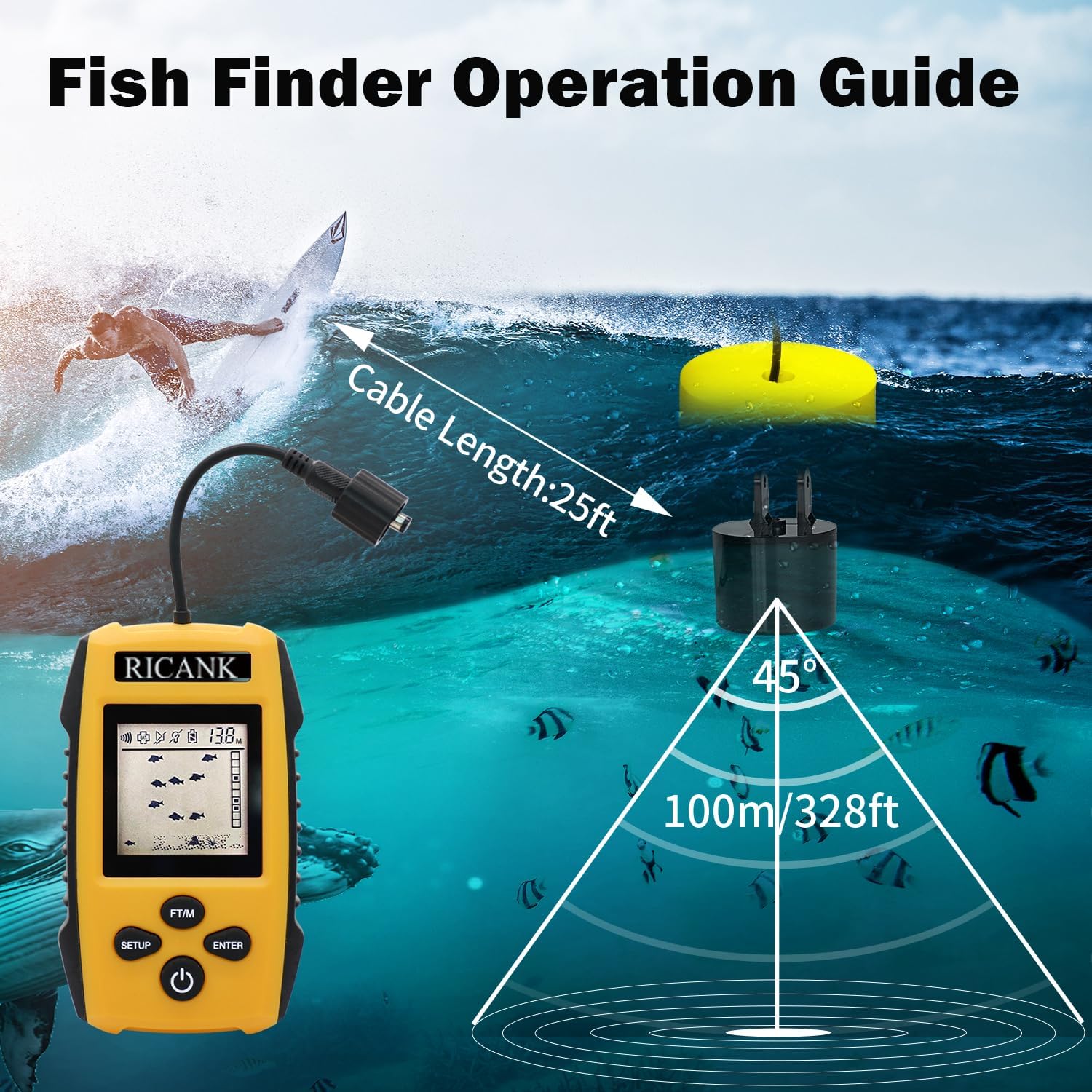 RICANK Portable Fish Finder, Handheld Fish Depth Finder Contour Readout Fishfinder Ice Kayak Shore Boat Fishing Fish Detector Device with Sonar Sensor Transducer and LCD Display Gear Fish Depth Finder