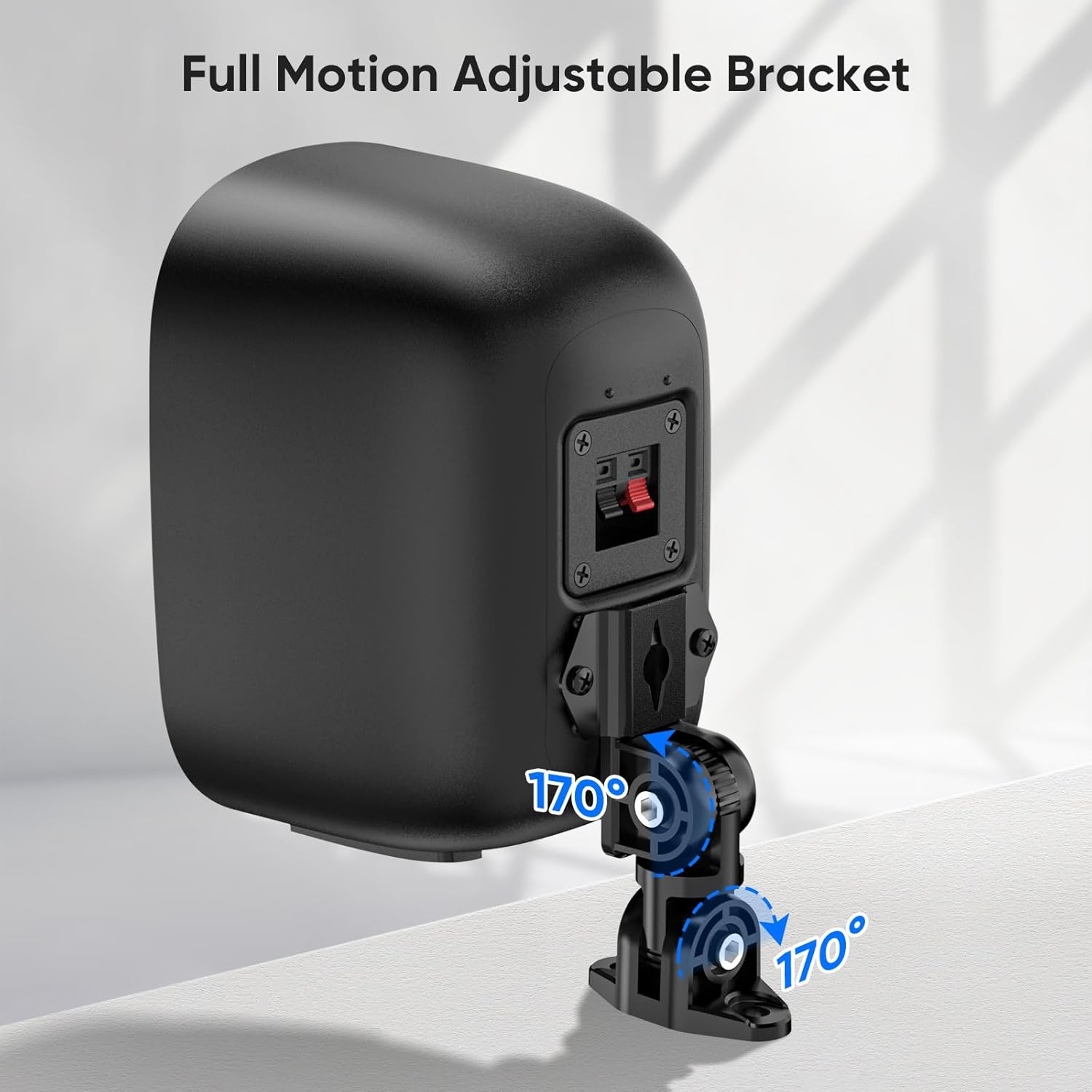 • FULL MOTION ADJUSTABLE BRACLET - Achieve perfect placement anywhere. The included versatile stand offers 140-degree rotation and tilt, allowing easy mounting on shelves, walls, or rails for optimal sound in home gyms, workshops, or as part of your Surround Sound Speakers system.