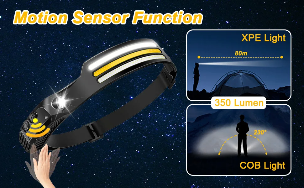 Light up your adventures with the Purilite Select Sensor LED Headlamp, featuring 5 lighting modes, motion sensor, and hands-free operation. Designed for camping, fishing, hiking, running, and outdoor work, this headlamp delivers 230° wide beam coverage with 8 brightness levels and 3 color options (red, yellow, white). Durable, waterproof, and USB rechargeable, it’s the ultimate outdoor companion for every scenario.
