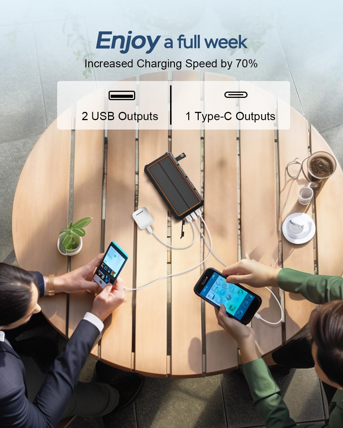 - 【3A High-Speed 3 Outputs and 2 Inputs】Supports up to 3 electronic devices to charge simultaneously. Three fast output ports (Two USB and a Type-C ) charging for your phone, tablet or other electronic devices. Two intputs (USB-C Port & Solar Panels)Provides higher efficiency and faster charging speed for power bank charging.