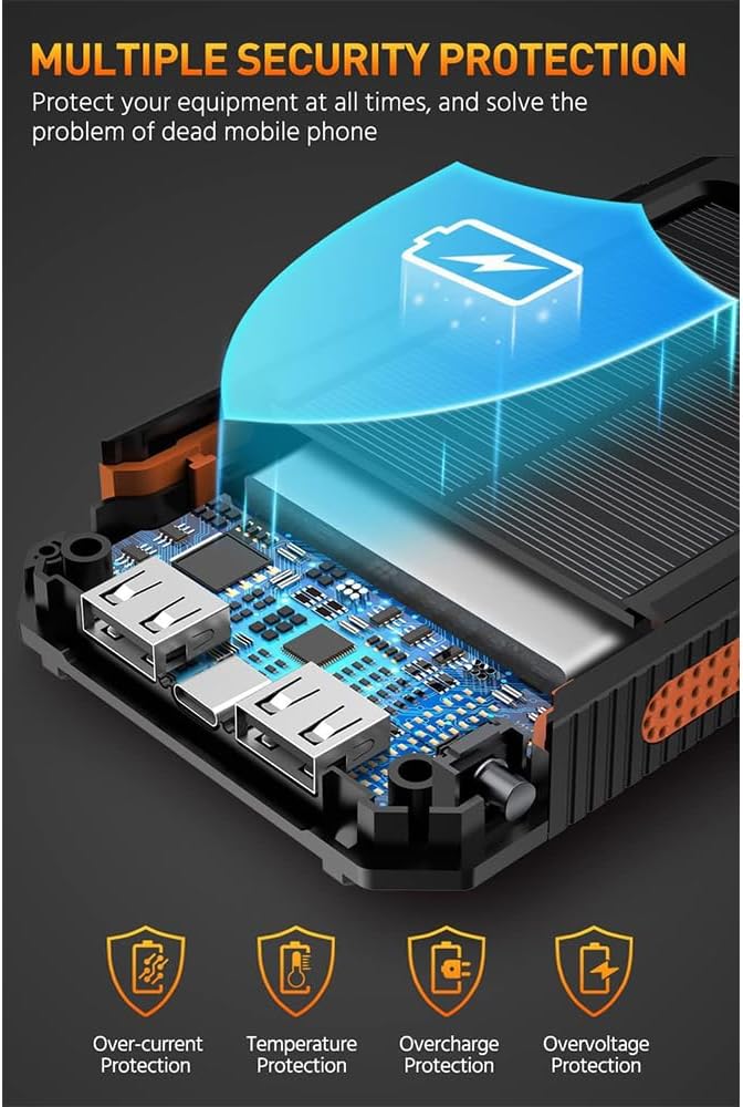 - This solar charger power bank comes with a dual bright LED flashlight, compass and keychain. Built to withstand harsh outdoor environments, it is waterproof, drop-proof and dust-proof. This portable phone charger battery pack power bank for camping essentials, hiking, fishing vacation, travel, festival gift and outdoors activities and emergency.