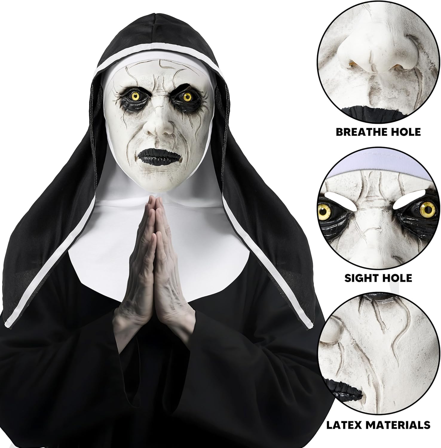 • Scary Nun Mask. Each package contains 1PCS Halloween nun mask with hood. Designed for Halloween carnival, it restores the image of classic horror characters, with realistic details, instantly transforming into a creepy evil nun! Whether it is a horror party, or a Cosplay performance, this mask can make you the focus of the audience and set off a screaming craze.