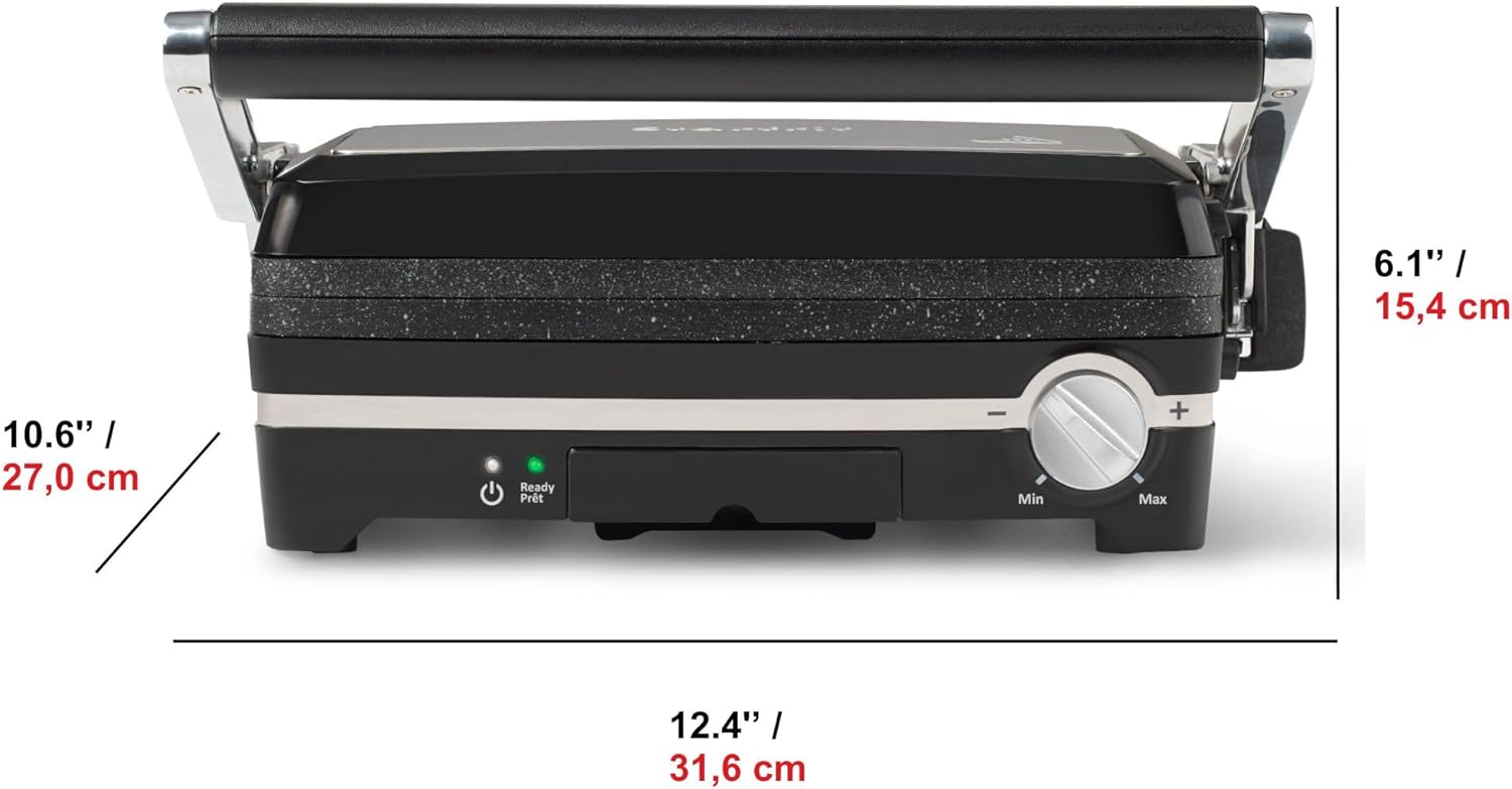 Introducing the Starfrit Panini Grill, a kitchen essential that combines culinary innovation with unbeatable convenience. Crafted with The Rock non-stick technology, this Panini press redefines your cooking experience. Its two reversible plates offer versatility like no other – one side featuring a flat griddle, perfect for those morning pancakes, while the opposite side boasts a grill for sizzling meats and veggies to perfection. Whether crafting mouthwatering paninis and sandwiches with the press closed or unleashing your inner grill master with its 180-degree opening, this appliance effortlessly adapts to your culinary desires. Cleaning is a breeze, thanks to The Rock non-stick surface treatment, while its adjustable temperature control and integrated drip tray enhance your cooking precision. Save time, energy, and savor every bite with this 1500-Watt powerhouse. Elevate your kitchen game with The Rock Panini Grill – where nothing sticks, it never warps, and it lasts longer.
