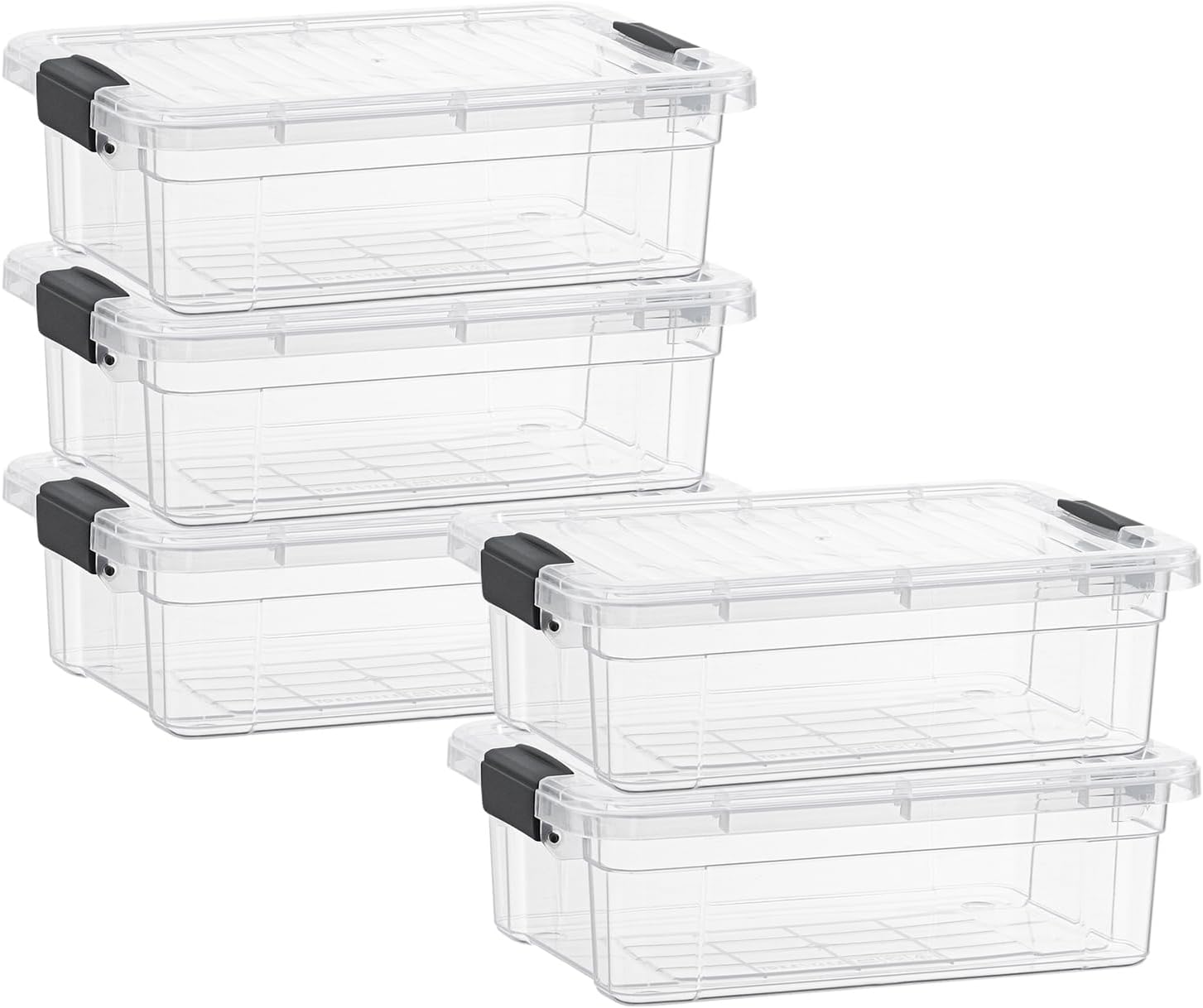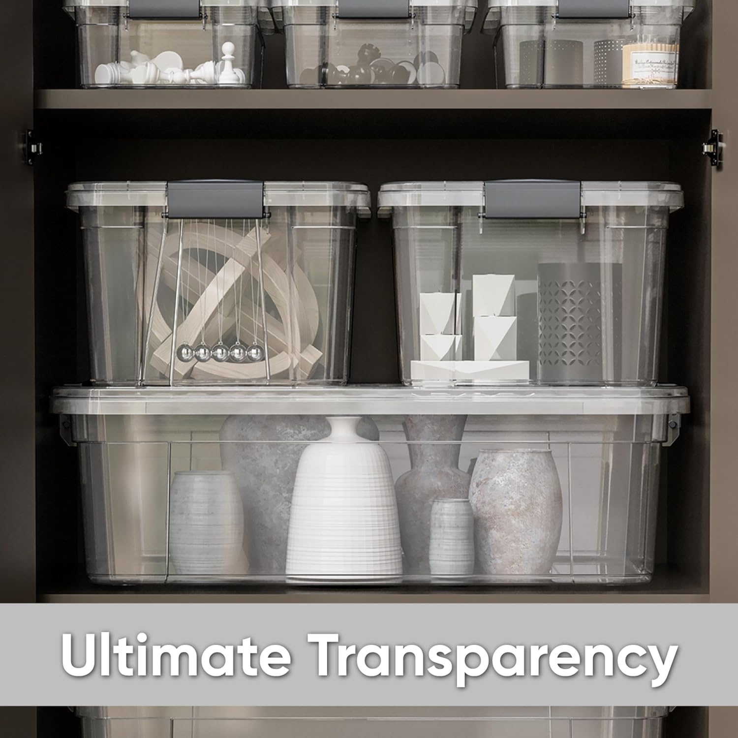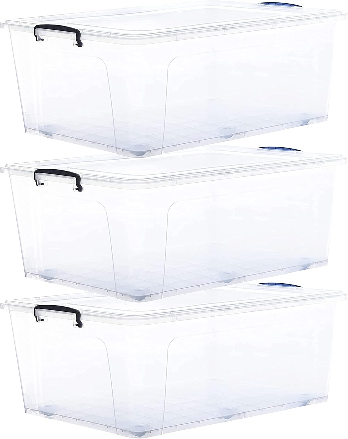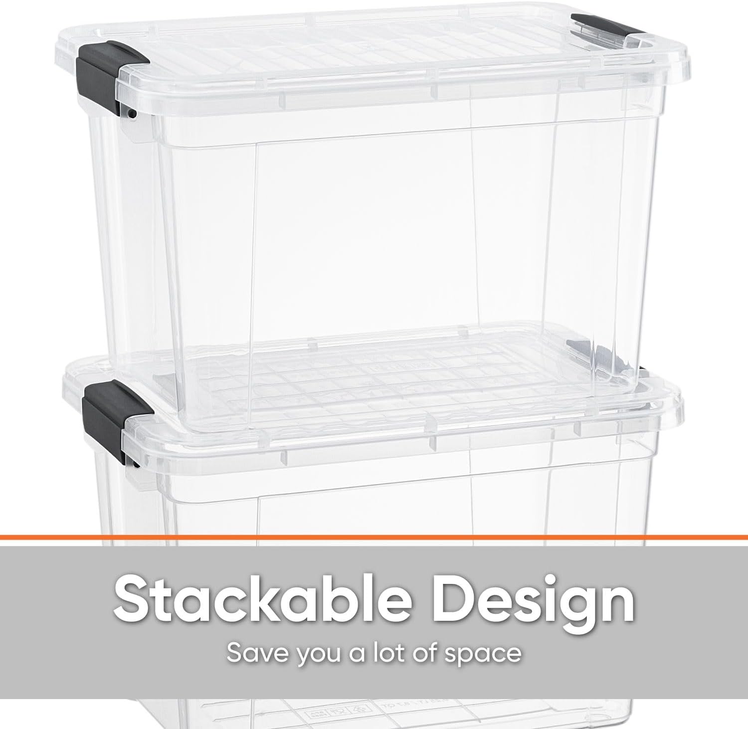 The bins are made of high quality, non-toxic BPA-Free plastic which makes the storage box odor-free. They are lightweight and clear for utmost convenience. The bottom of the container clicks into the dented lid for safe stacking. Our clear storage bins with lids come in many sizes to fit your entire home, garage, dorm room, etc.