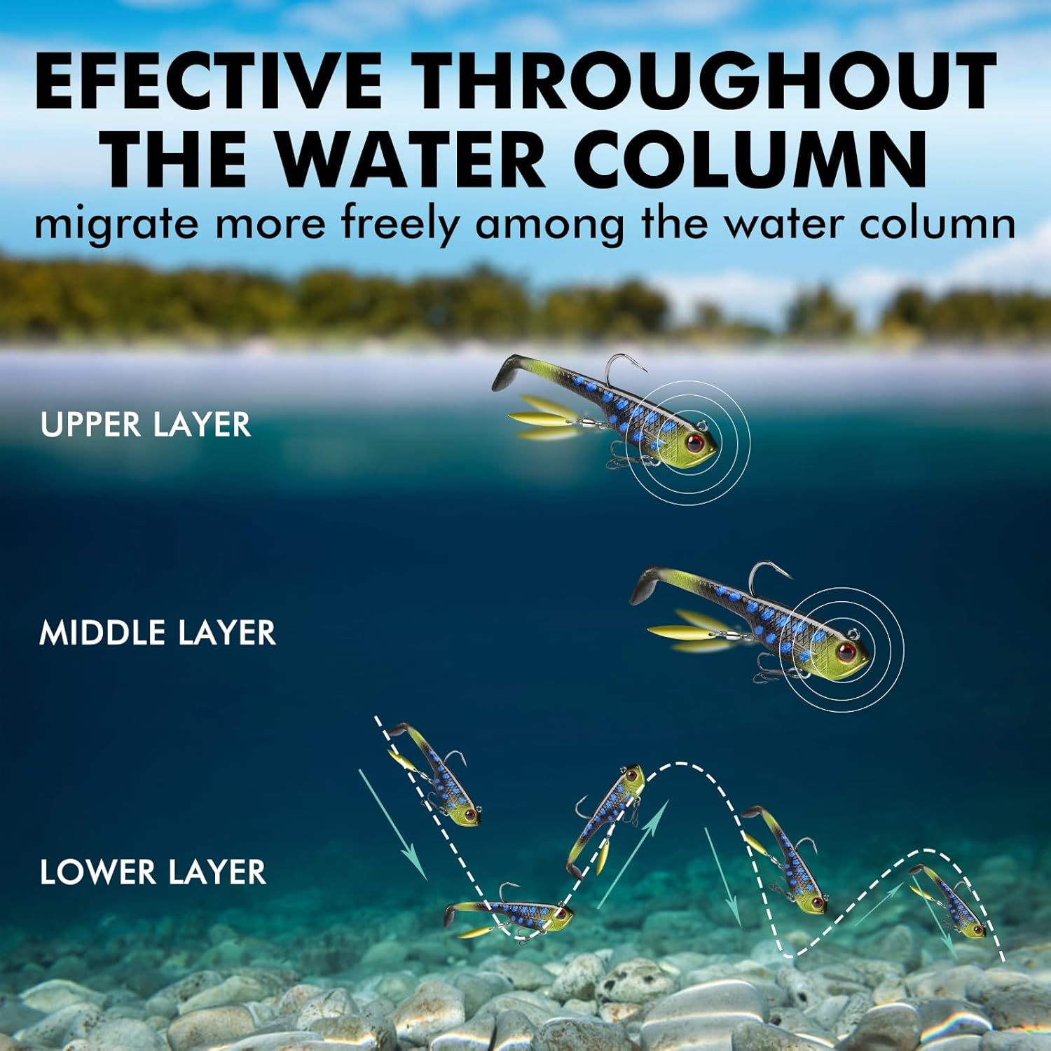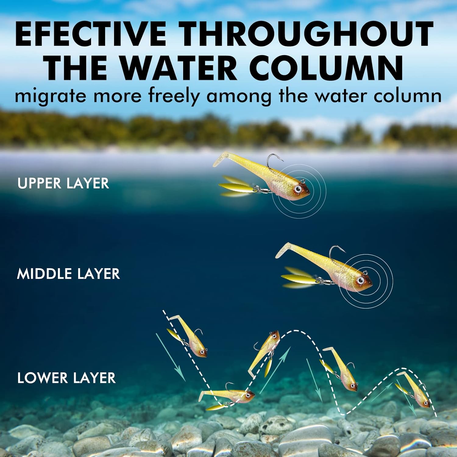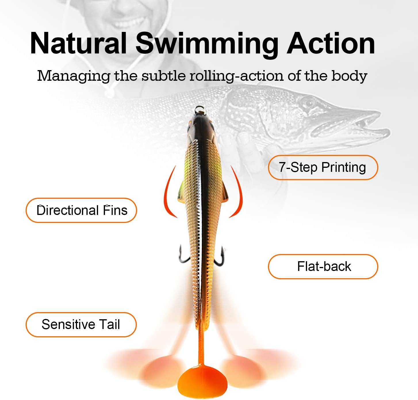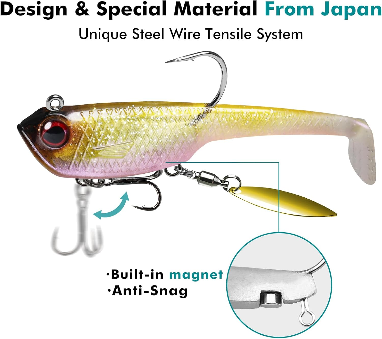 UNIQUE DESIGN: 3D t-shaped soft tail with 360° spinner blade can kicks and thumps even at slow speeds. A super-lifelike soft jerkbait whose lively design perfectly emulates erratic baitfish action.