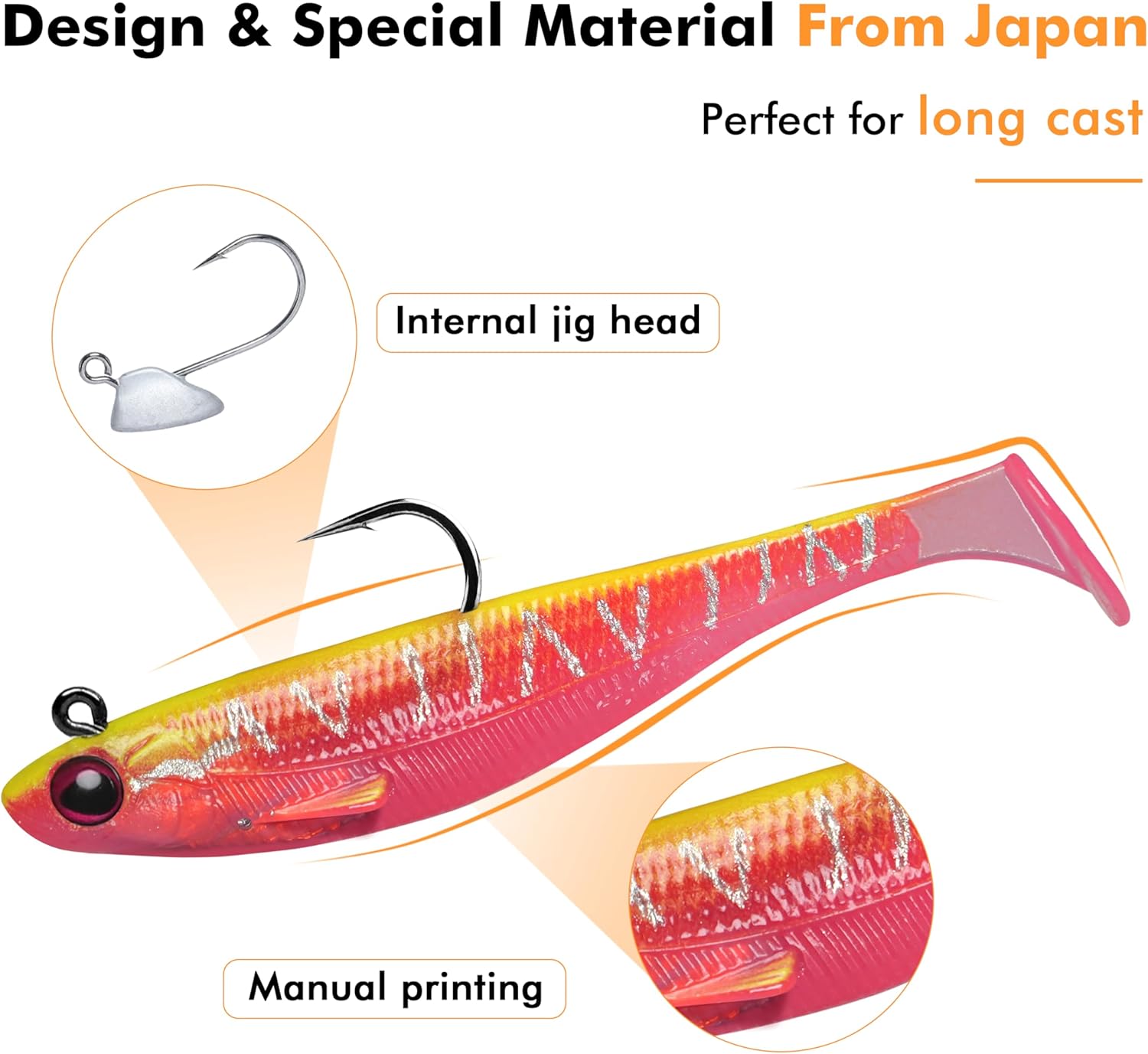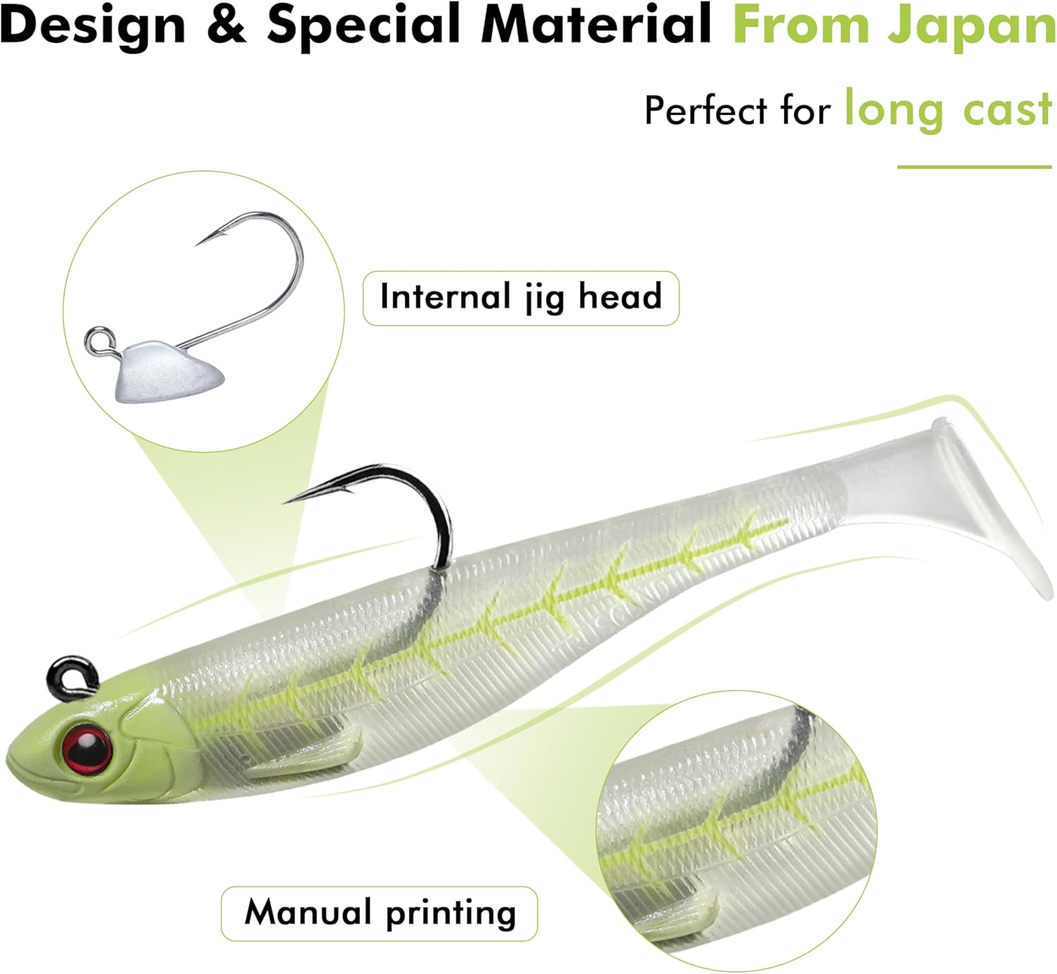 LONG CASTING JIGHEAD: Having an ideal weight for long casting and slow sinking, Truscend Jig lures can achieve a slow, flutter presentation. Featuring a precisely engineered shape, the soft body swimbaits has a great kicking action at both ultra-slow speeds and moderately fast speeds.
