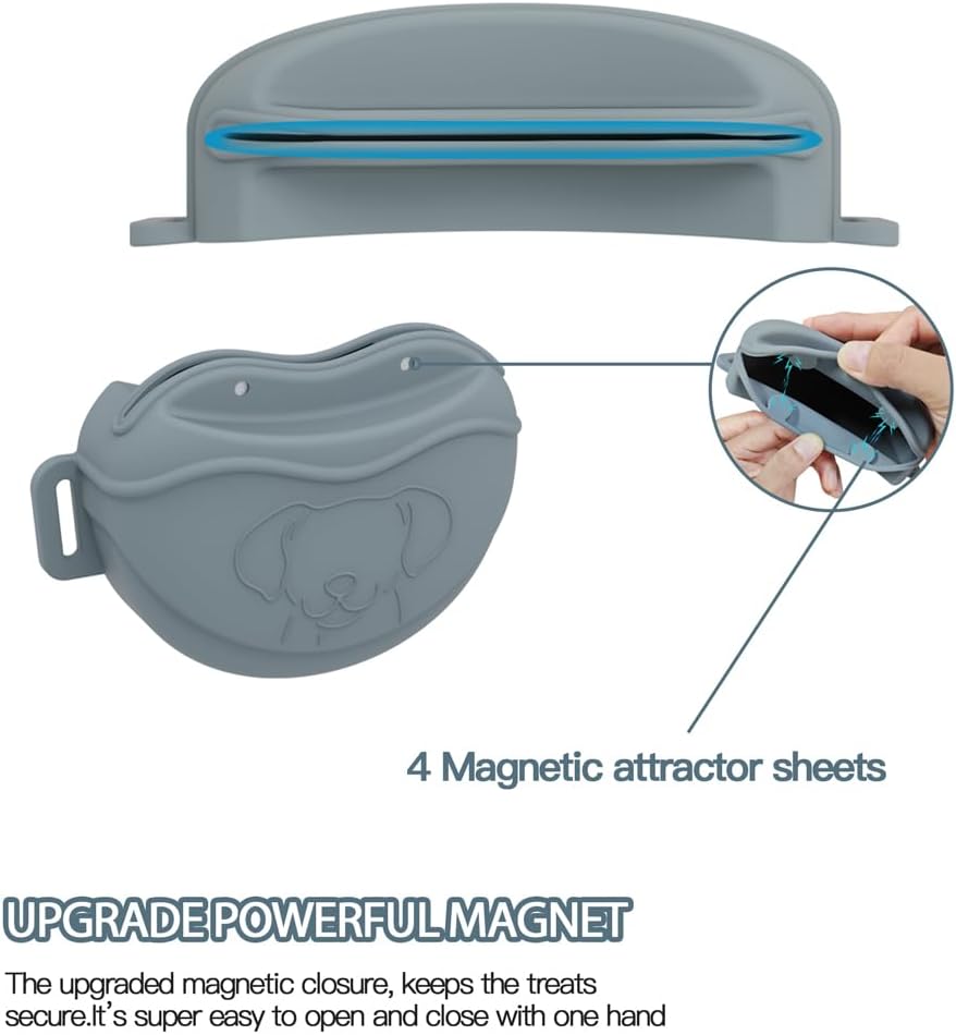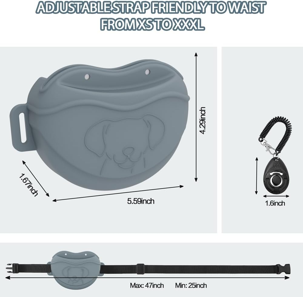 TUCANA Silicone Dog Treat Pouch for Pet Training – Upgraded 4 Strong Magnets Enhanced Magnetic Closure, Ease of Cleaning, Come with Adjustable Wasit Belt and Effective Dog Clicker (Grey)