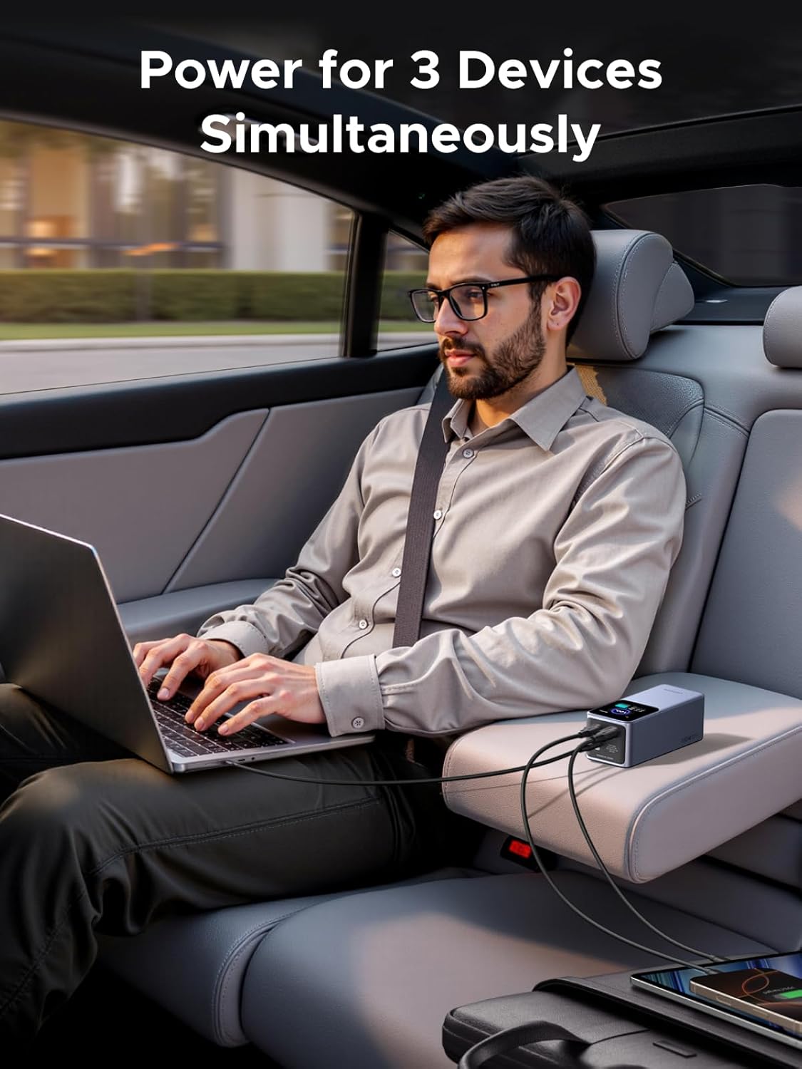 - 100W Fast Charging: This laptop power bank can quickly power multiple devices such as laptop and phone at the same time, the maximum output power of the OUT1 port is 100W, charging a MacBook Pro 16'' by 43% in 30 mins or an iPhone 15 by 55%