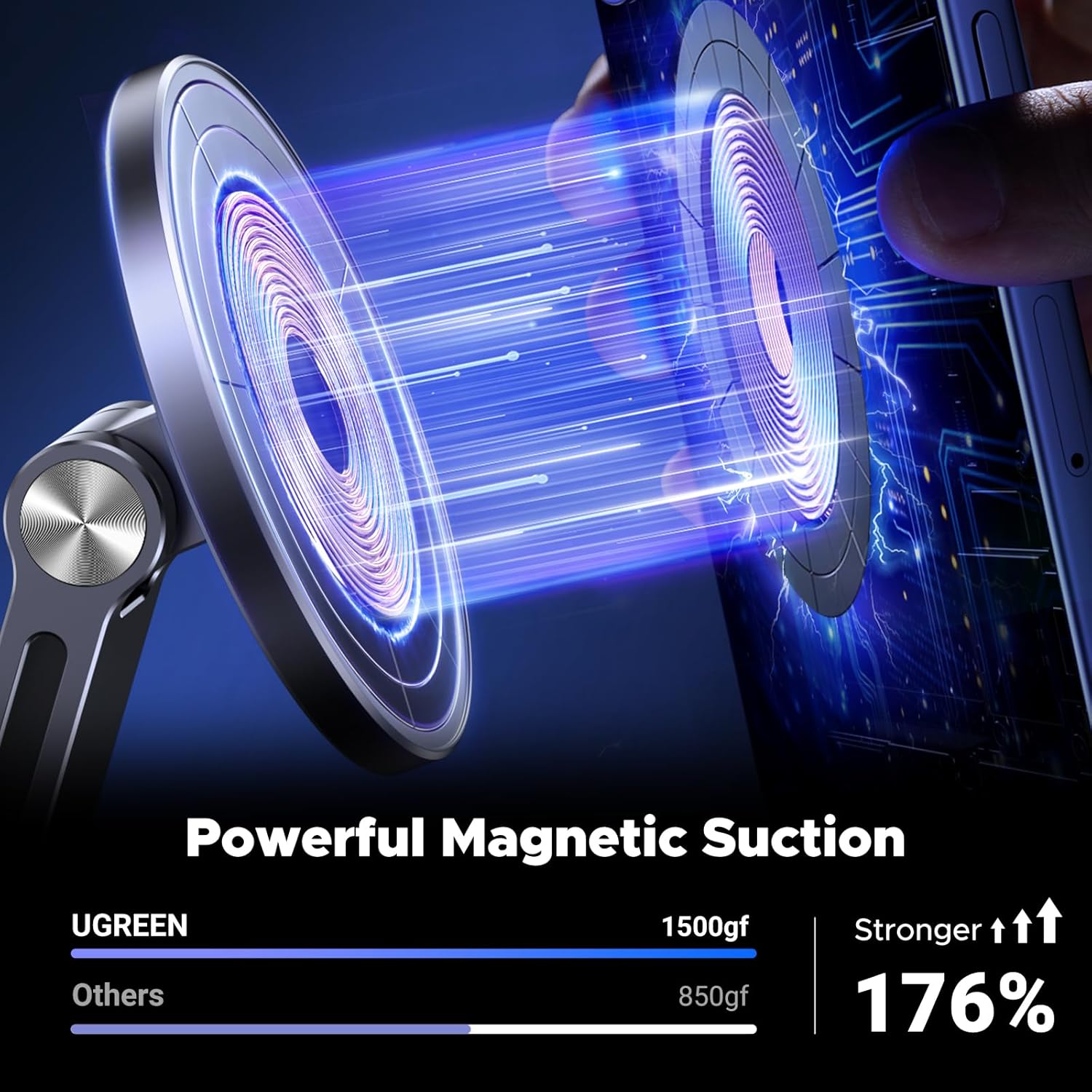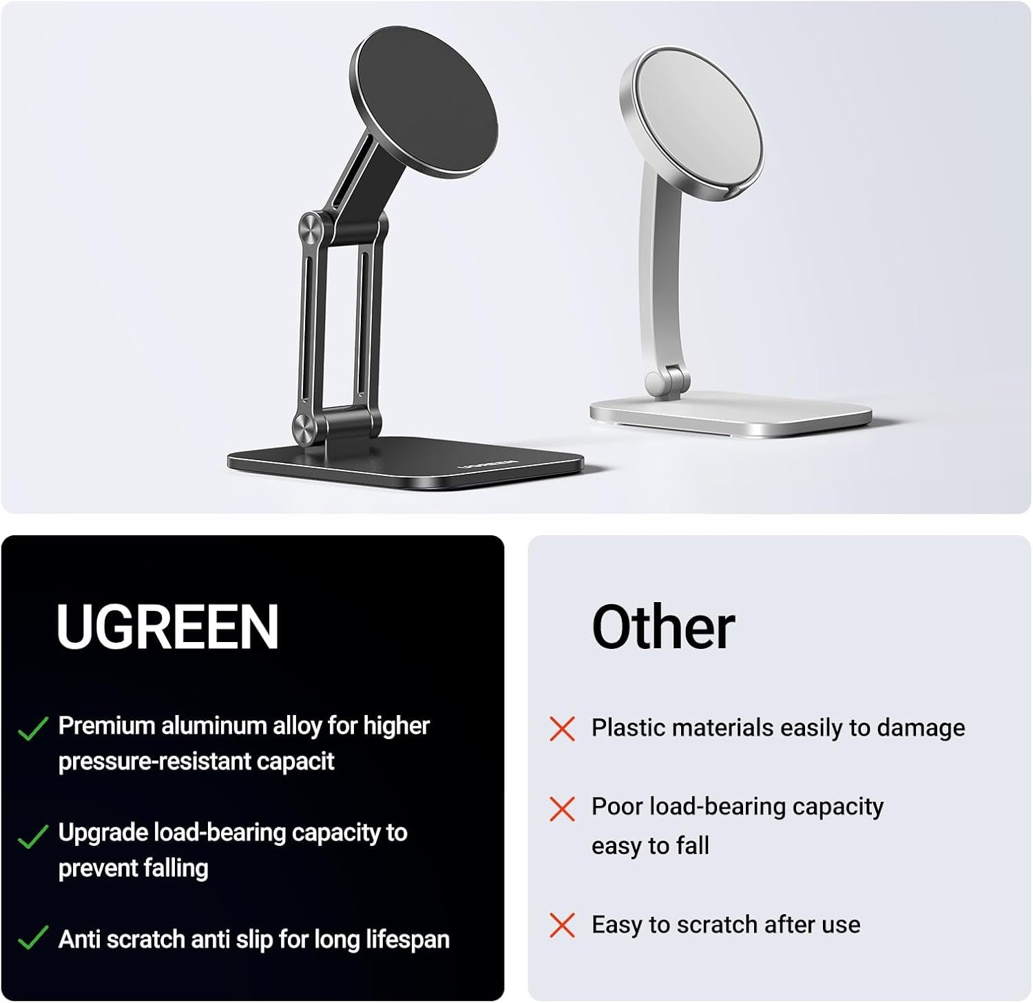 - Powerful Magnet: UGREEN magnetic phone stand for desk built-in strong magnets that firmly fix iPhone 12 and above devices or MagSafe accessories to the phone stand. Only need to bring the device close to the Magsafe cell phone stand, and it will be accurately and firmly absorbed by the phone stand, making it easy to install and disassemble in one second. It is more convenient and safer than traditional phone stands. Please note that this product does not support MagSafe charging