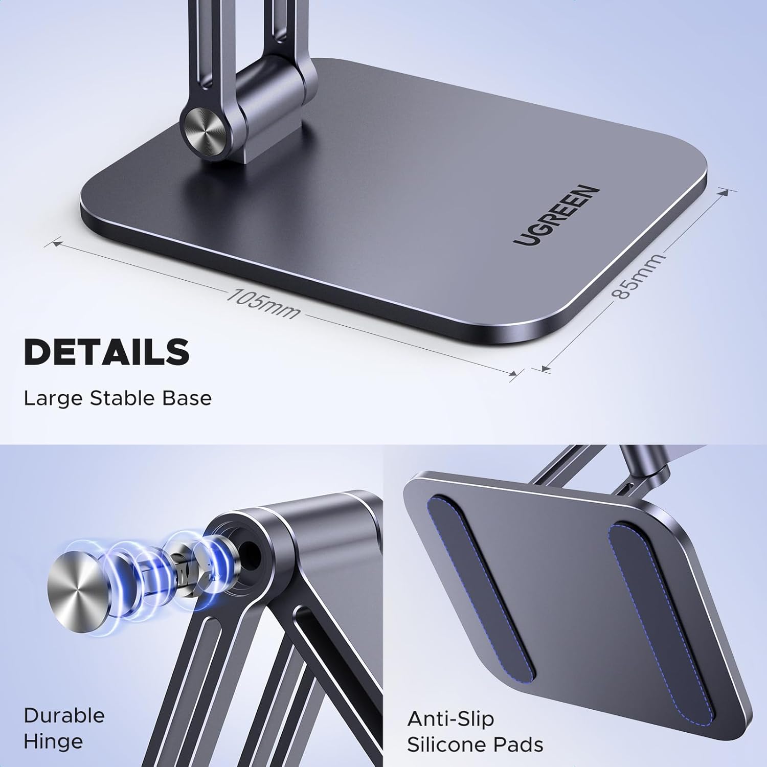 - Stable and Durable: The cell phone stand is made of high-quality aluminum with smooth edges and a high finish. Compared with other plastic phone stands it has a longer service life. The thickened base ensures extreme stability and places the phone without tipping, so don’t have to worry about your phone falling when you slide the screen or type