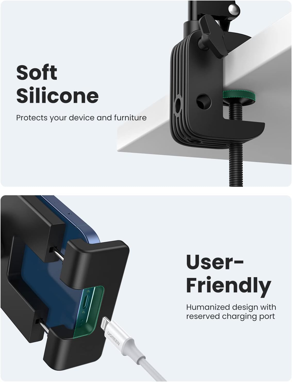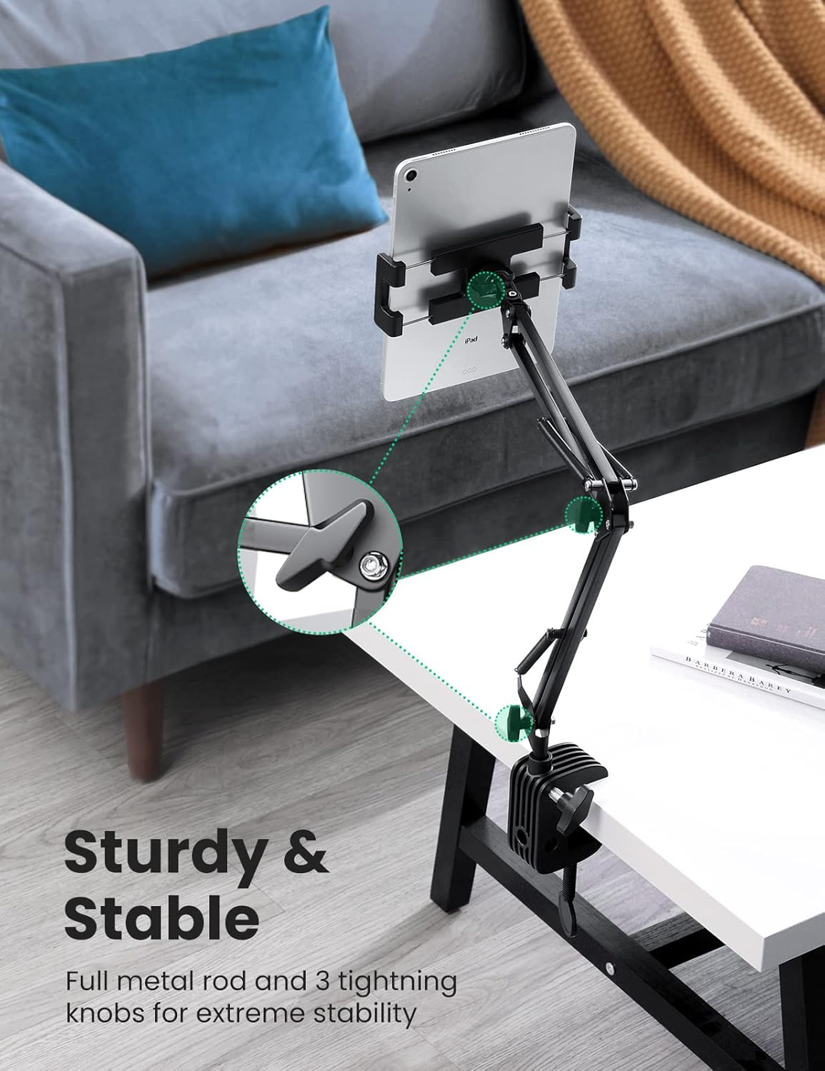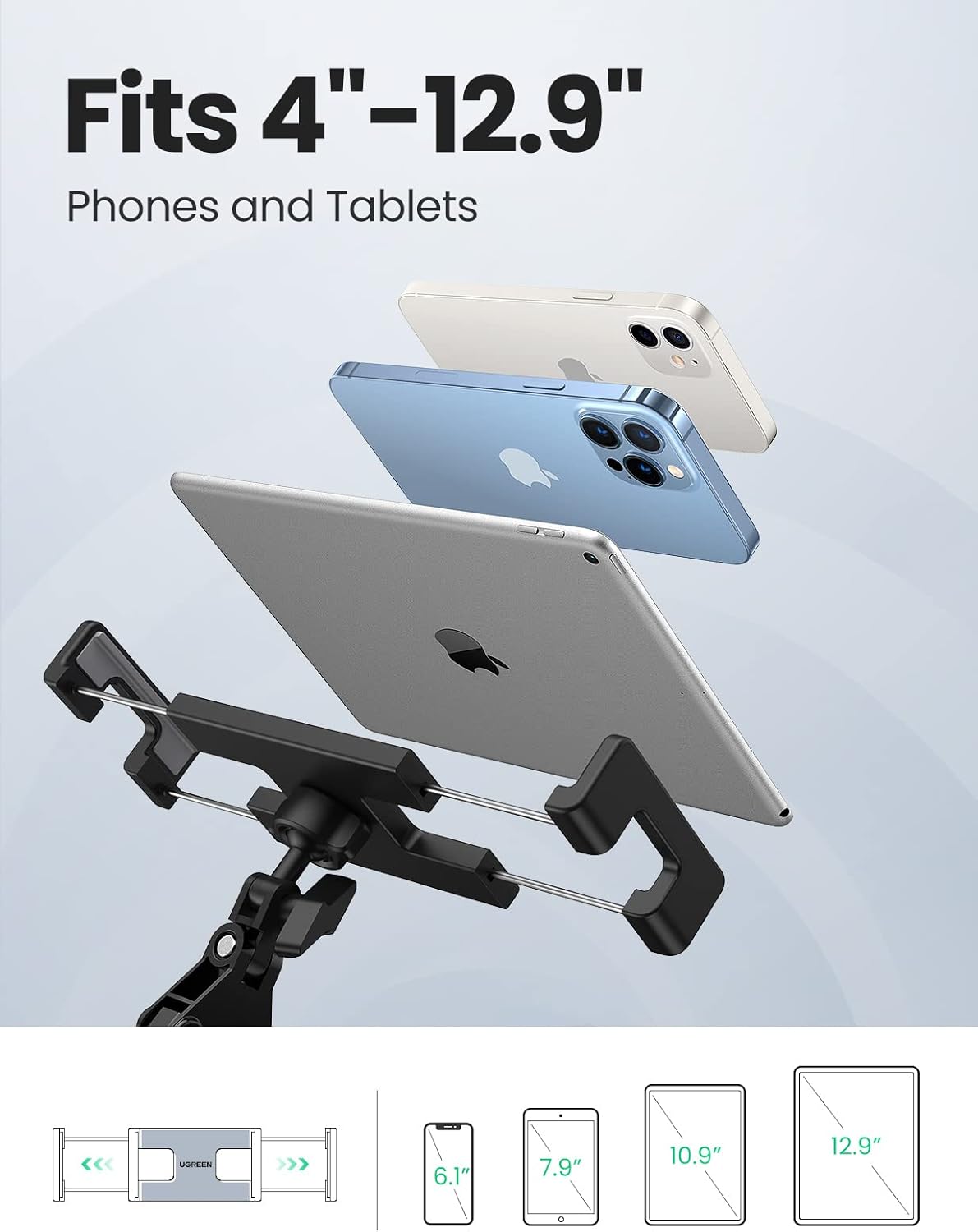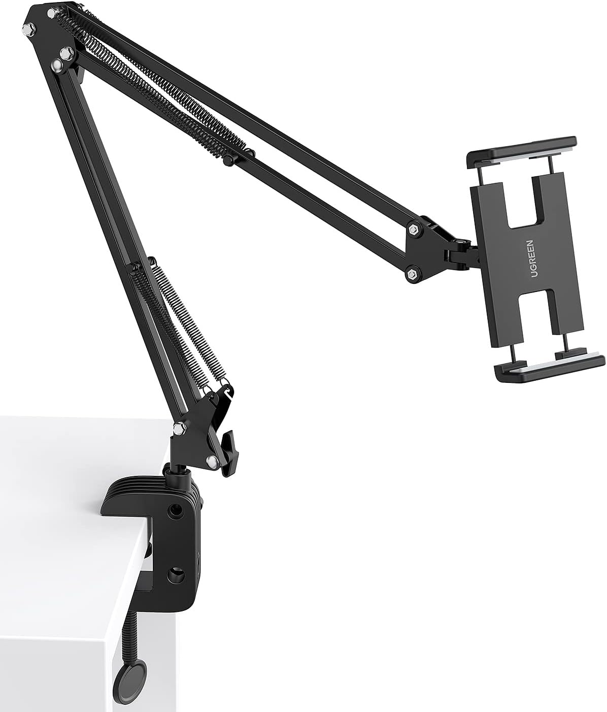 - Hands-Free Tablet Holder: UGREEN Lazy Arm Mount Stand holds your phone or tablet firmly at the ideal distance and at the perfect viewing angle. The Long Arm Tablet Clamp secures your tablet or phone in position and offers a comfortable hands-free video call or reading experience to you
