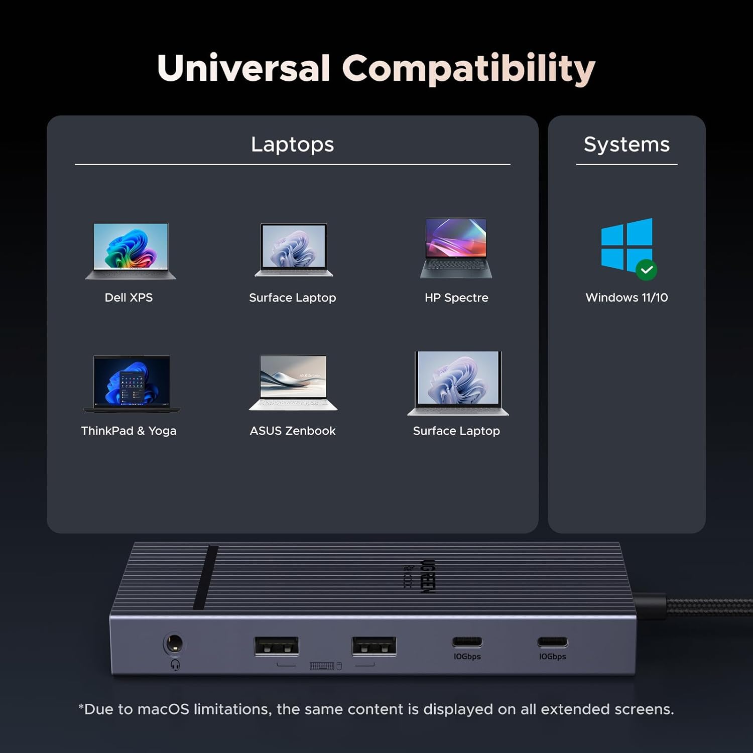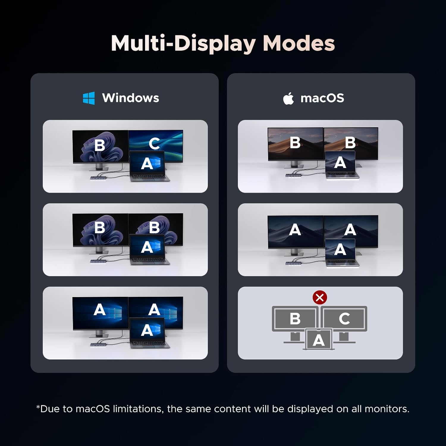 • Note: If you are using a MacBook and want to connect multiple monitors with different displays, we do not recommend this docking station. For macOS, the displays on all external monitors will be identical
