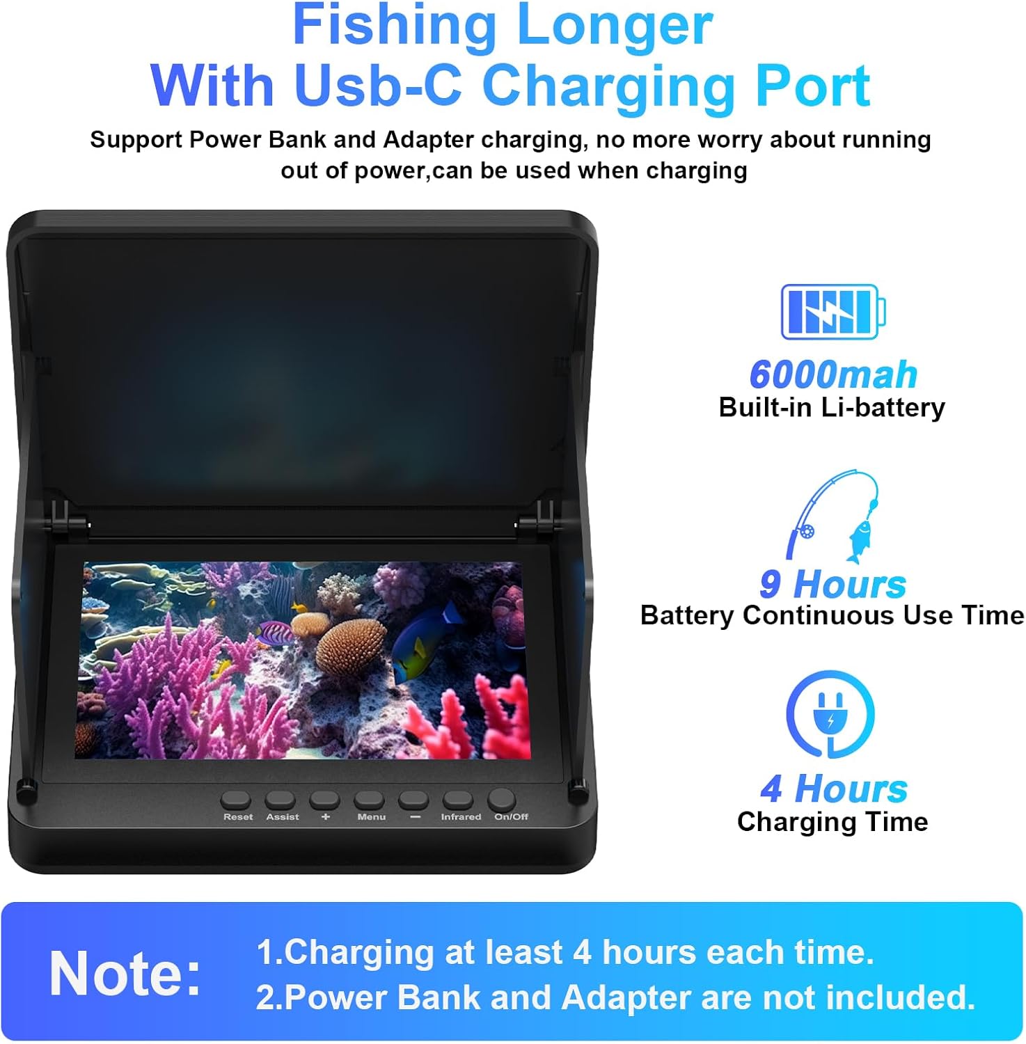 6000 MAH LITHIUM BATTERY: Our ice fishing camera built-in 6000mAh lithium battery, the camera can be used continuously for up to 8-9 hours, ensuring the camera runs stably, allowing you fish longer and explore the underwater world without worries. it can also be charged with a power bank, which is convenient for outdoor use. It is a good partner for people who like sea fishing or ice fishing