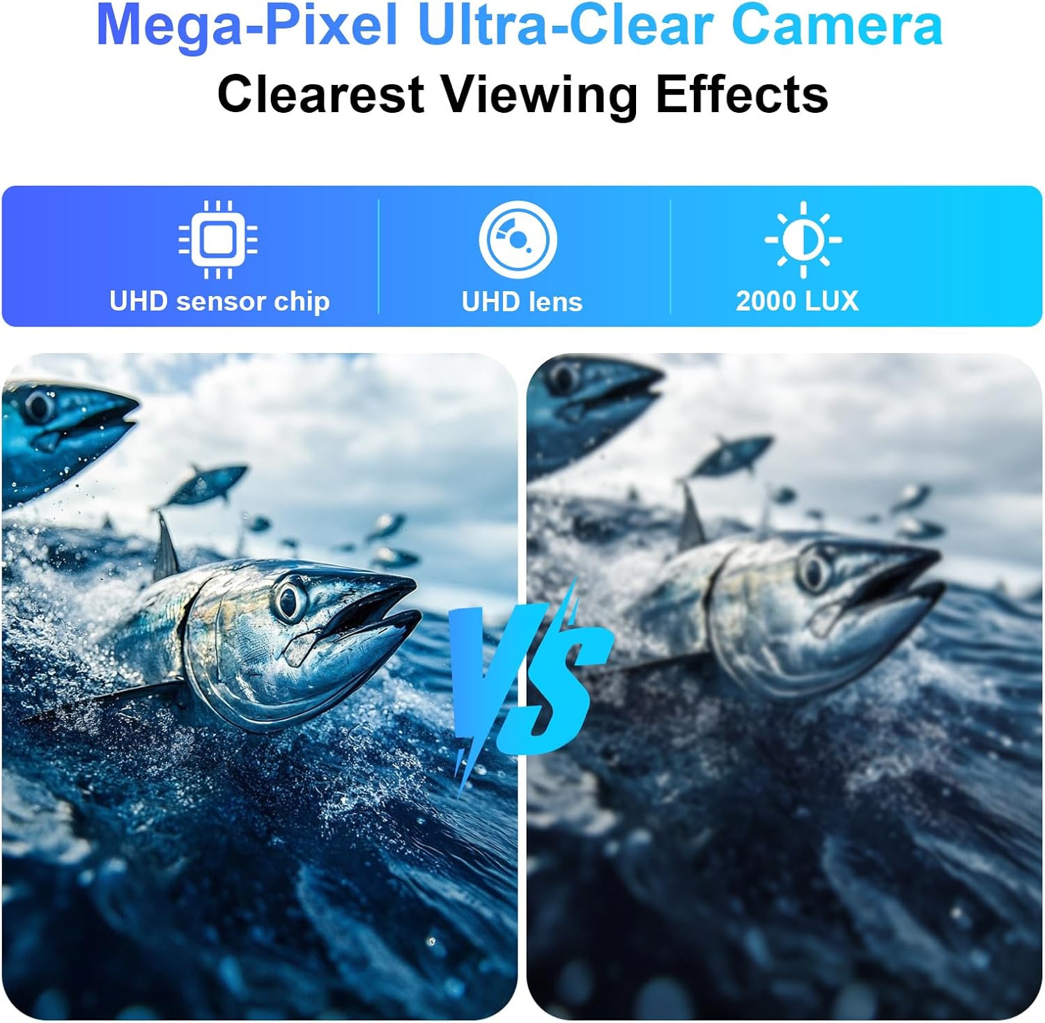 WATERPROOF HD CAMERA WITH SUNVISOR: This fish camera underwater for fishing with monitor has a brightness of 2000 lux, equipped with 8 infrared night vision lights and a 220° wide angle with brightness adjustable. The wide field of view can capture real and delicate underwater scenes. It can stay clear even in dark environments