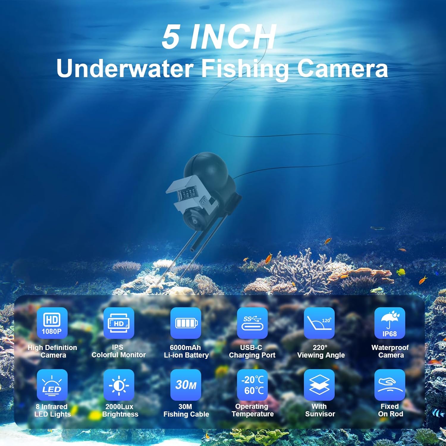 Underwater Fishing Camera, Portable Video Cameras Fish Finder, 5 Inch HD LCD Monitor, 8pcs Infrared Lights Night Vision, Waterproof Fishing Camera for Ice Lake Boat Sea Kayak Fishing