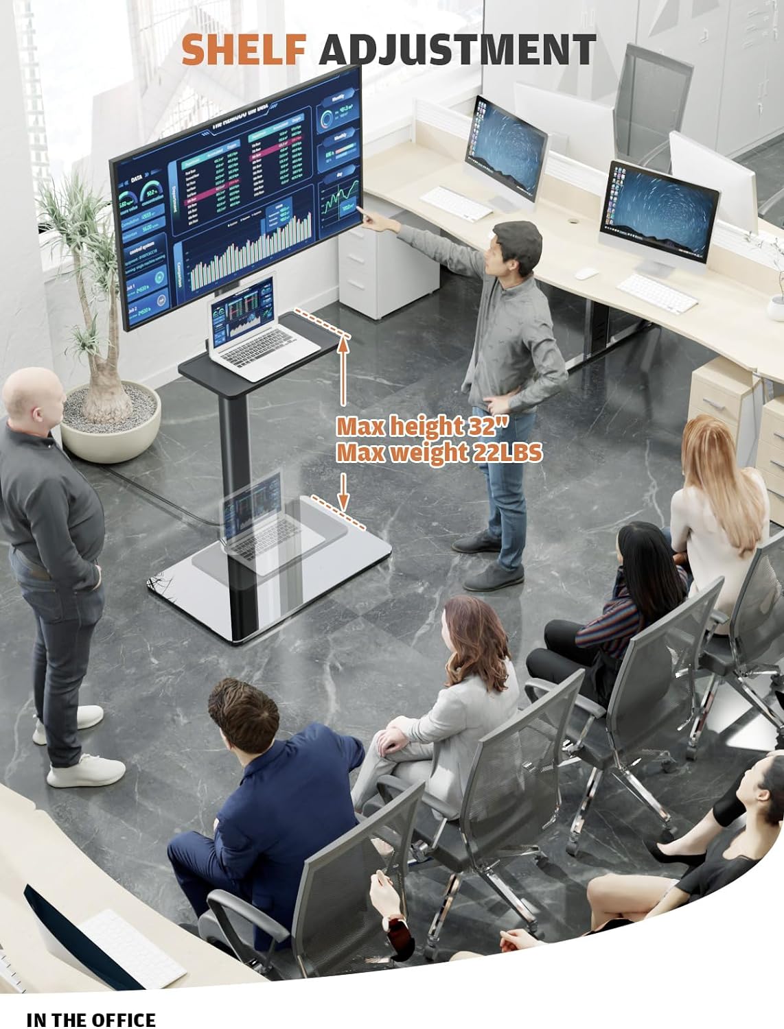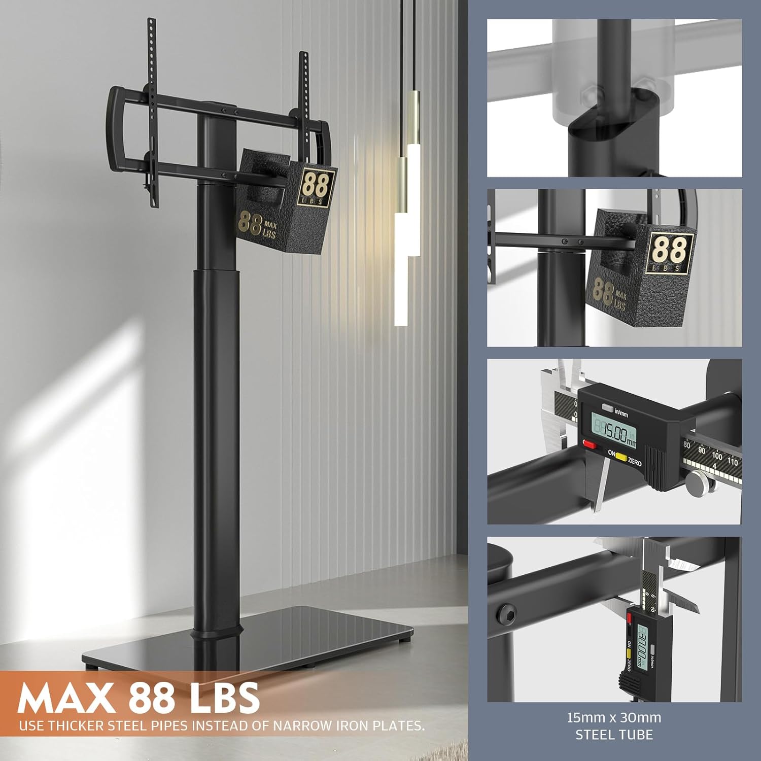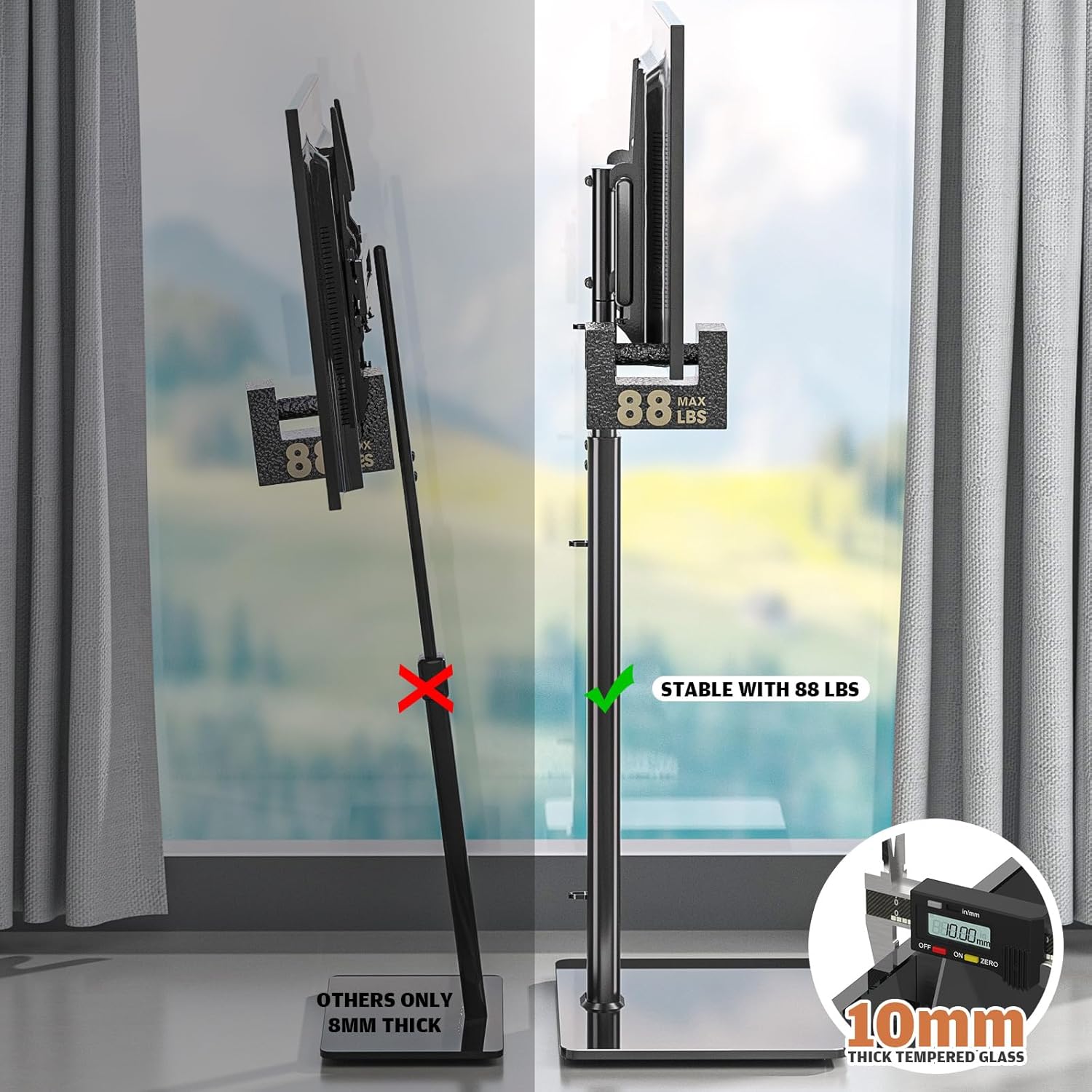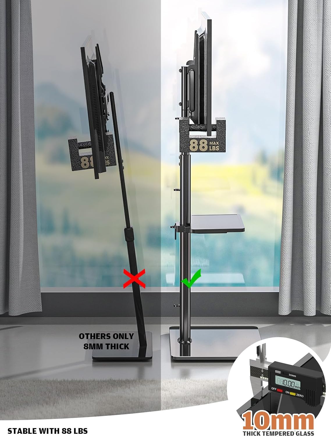 - SMART DESIGN ☞ This smart floor TV stand comes with 10mm solid tempered glass base that connects to a solid steel pillar which provides stable support for your TV that creates a modern look for your audio video equipment, it can hold up to 88lbs