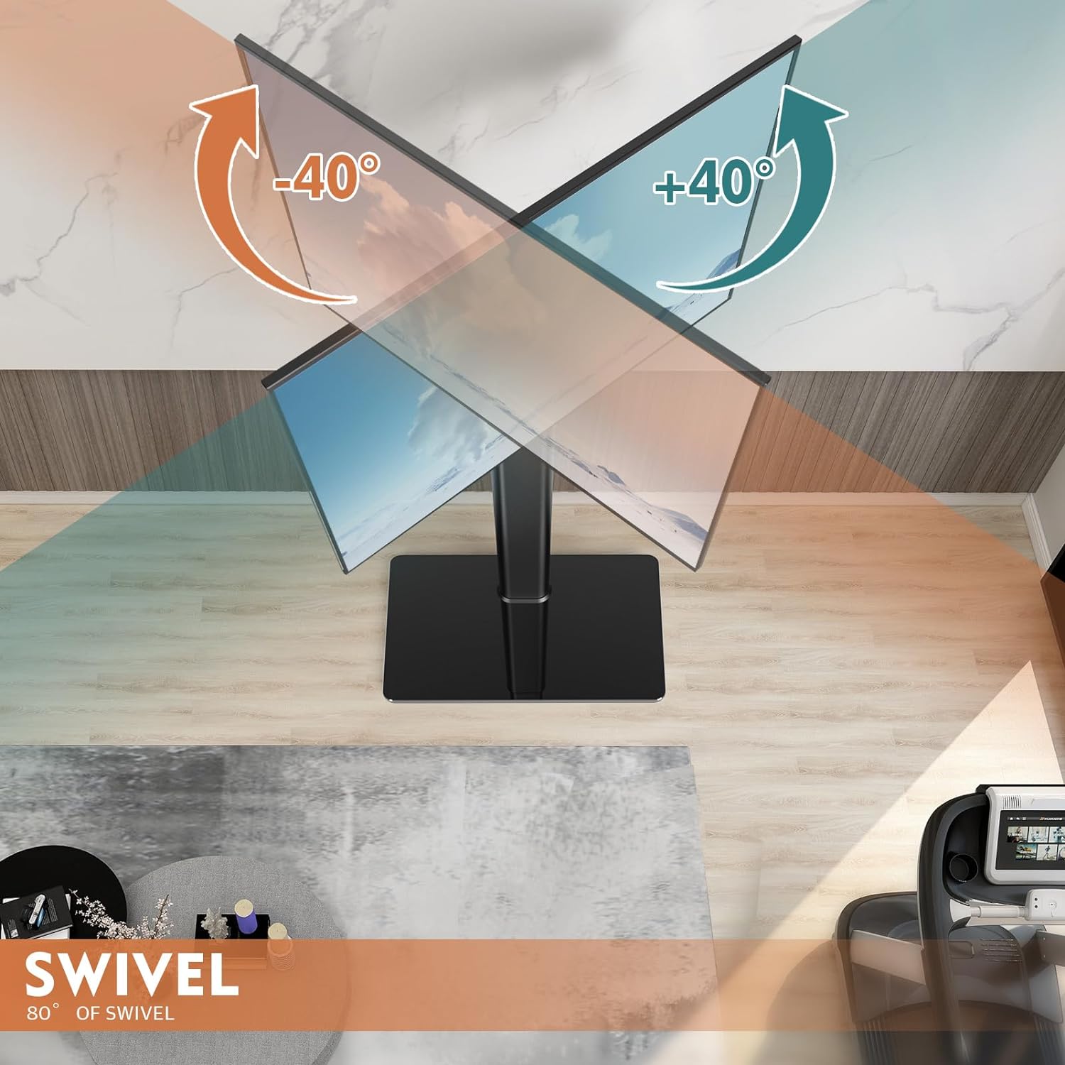 - MULTIFUNCTIONAL FLOOR TV STAND ☞ My functional TV mount have 4 level height adjustment in order to choose your best space, besides -40 to +40 degree swivel mount can choose the best viewing to catch TV entertainment, Tilt function can expand the viewing angle in order to enjoy your view effection