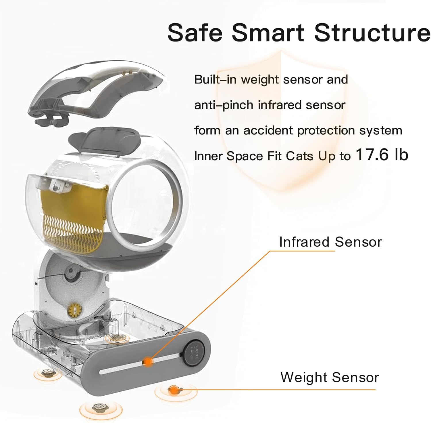 🐱Advanced Safety Protection🐾Our litter box is equipped with a built-in weight sensor and an anti-pinch infrared sensor that work together to provide a reliable accident protection system. If the system detects your cat inside, it won't activate the cleaning process. The "bucket cabin integrated" design further prevents any pinching accidents, enhancing safety for your furry friend.