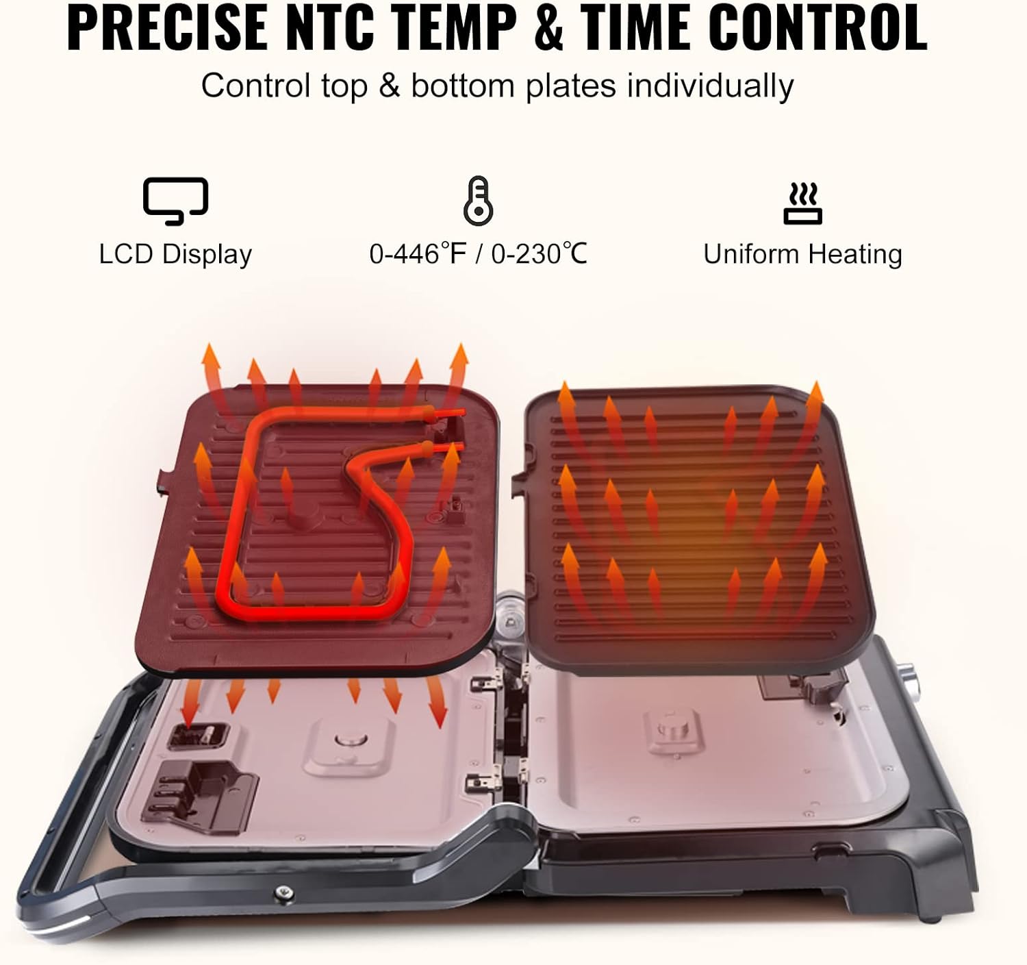 • Precise NTC Temp & Time Control: The electronic temperature control on each plate puts you in command, and the timing function ensures the food is perfectly cooked. The temperature's range from 0-446℉ / 0-230℃.