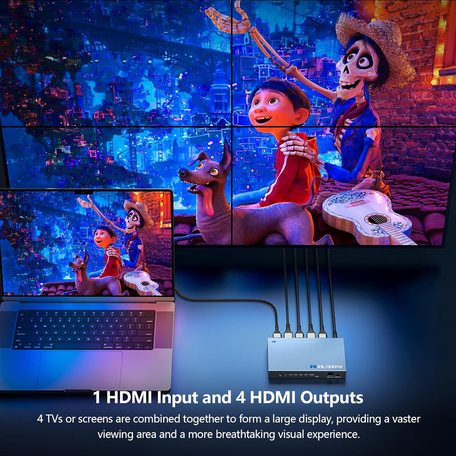 •  ✅【HDMI 1 in 4 out】: Connect 1 HDMI source to 4 TVs/screens for an immersive multi-screen large video wall. Stream whatever you desire onto a giant screen, lag-free, and compatible with all the apps you love.