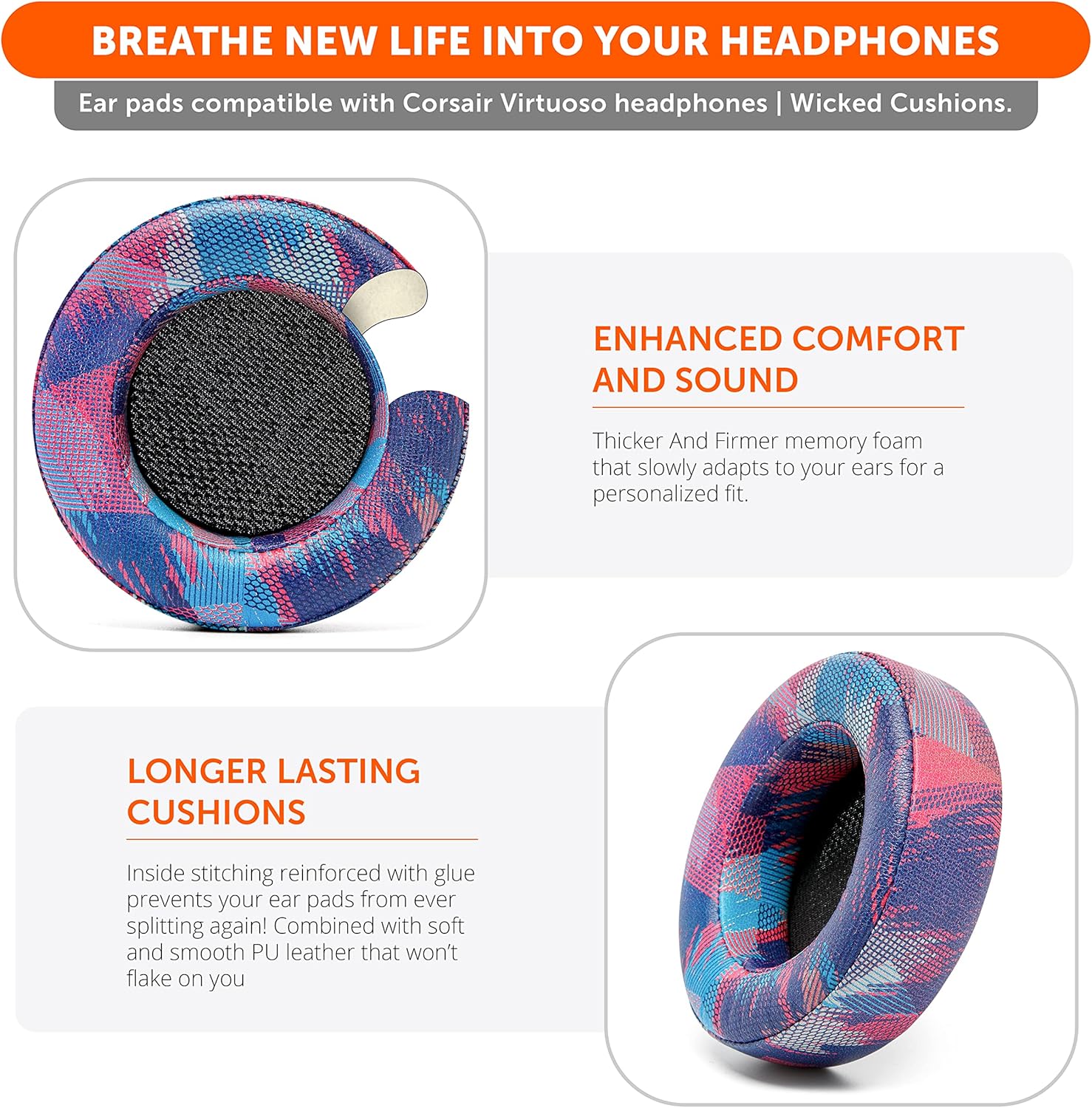 - Rugged Durability: To improve the longevity of your Corsair Virtuoso headphones, we added reinforced stitching and upgraded PU leather to these ear cup replacements. The durability of your Corsair Virtuoso earpads is of extreme importance, Wicked Cushions Corsair Virtuoso replaceable cushions are made of the best quality materials to help you enjoy your headphones for as long as possible.