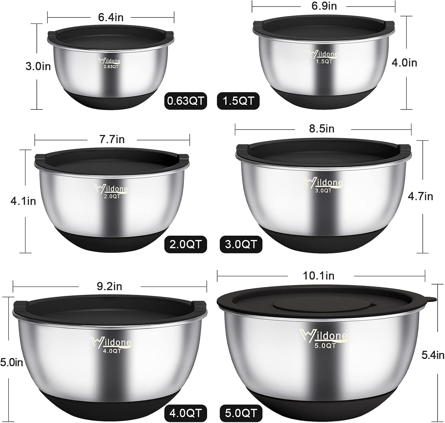 Wildone Mixing Bowls with Airtight Lids, 22 PCS Stainless Steel Nesting Bowls, with 3 Grater Attachments, Scale Marks & Non-Slip Bottom, Size 5, 4, 3, 2,1.5, 0.63QT, Ideal for Mixing & PreppingPL17-B091HP14Y9
