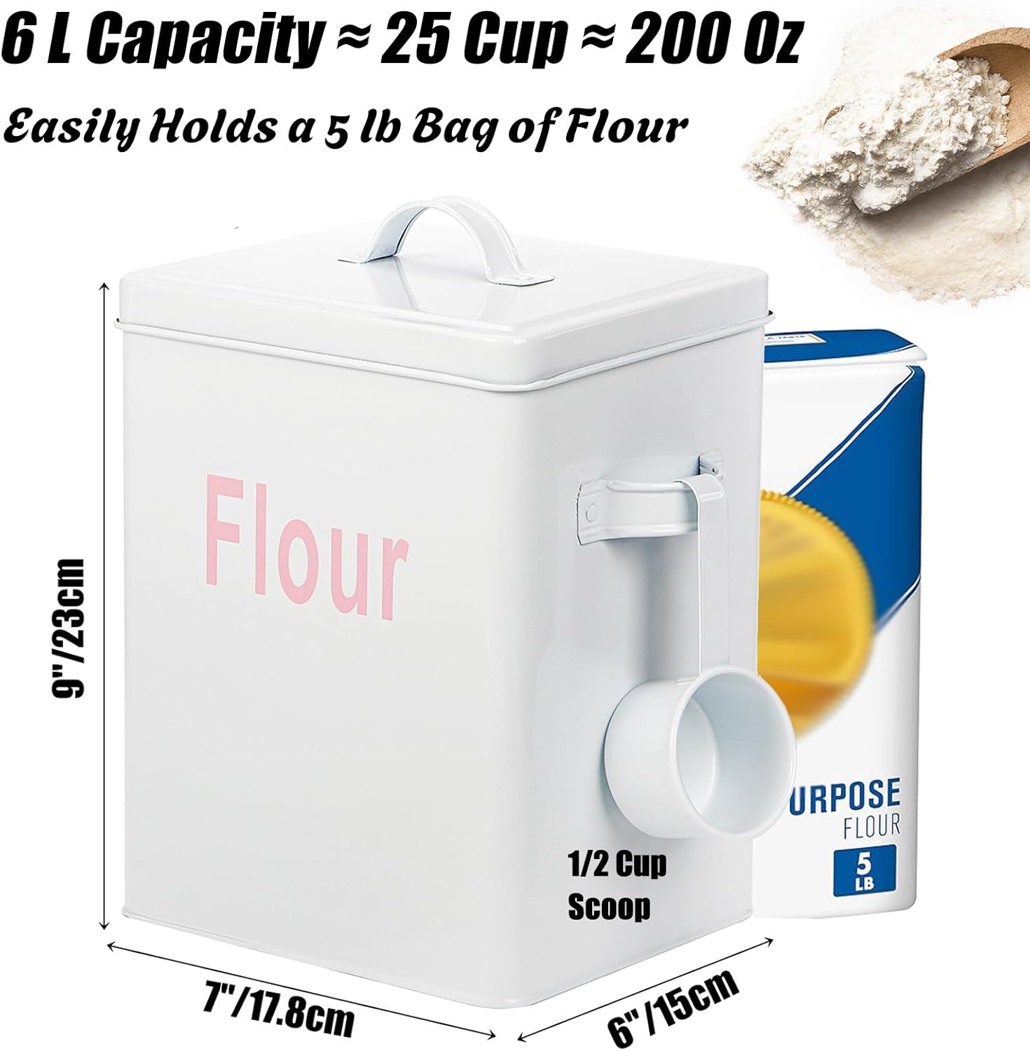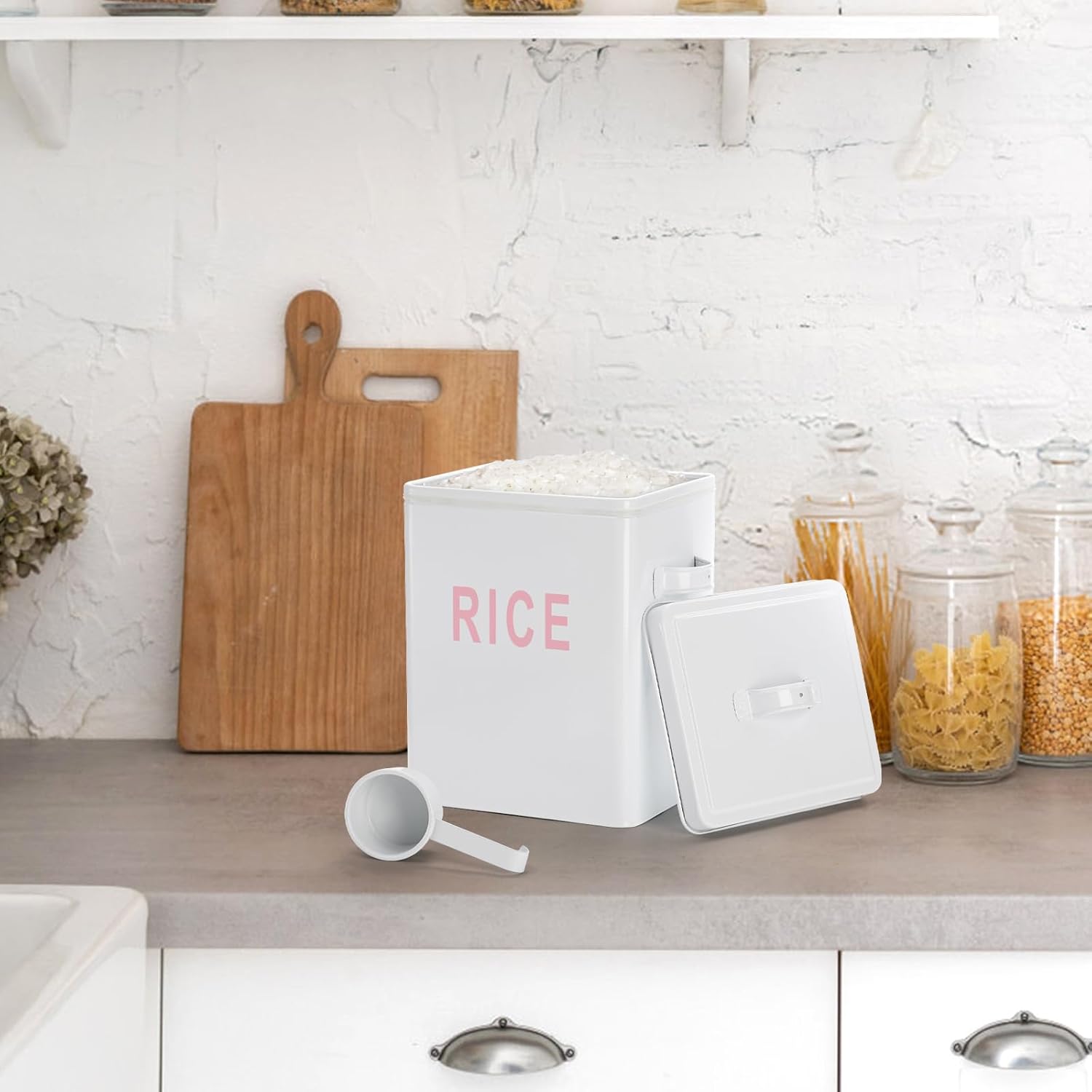 YOUEON 10 Lbs Metal Rice Storage Container, Square Rice Canister with Lid and Measuring Scoop, Countertop Sealed Food Storage Container for Cereal, Beans, Pet Food, White