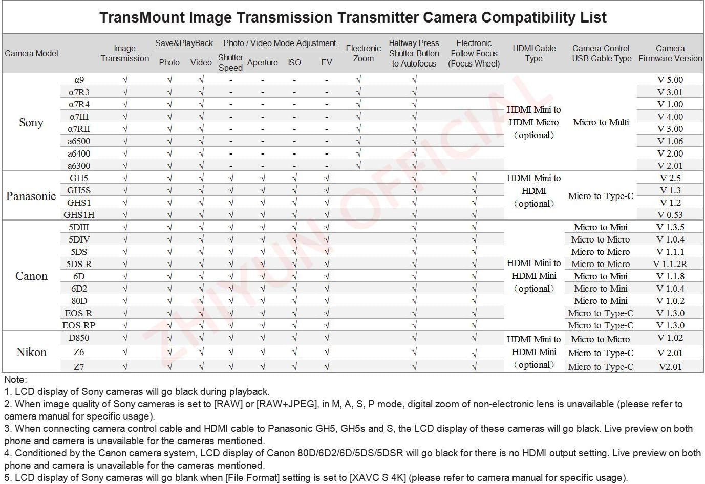 • 14 hours battery life; Brand new TransMount Image Transmission Module (accessory) to offer 1080P 30fps highly synchronised transmission (100-meter distance) and up to 3 screen receivers