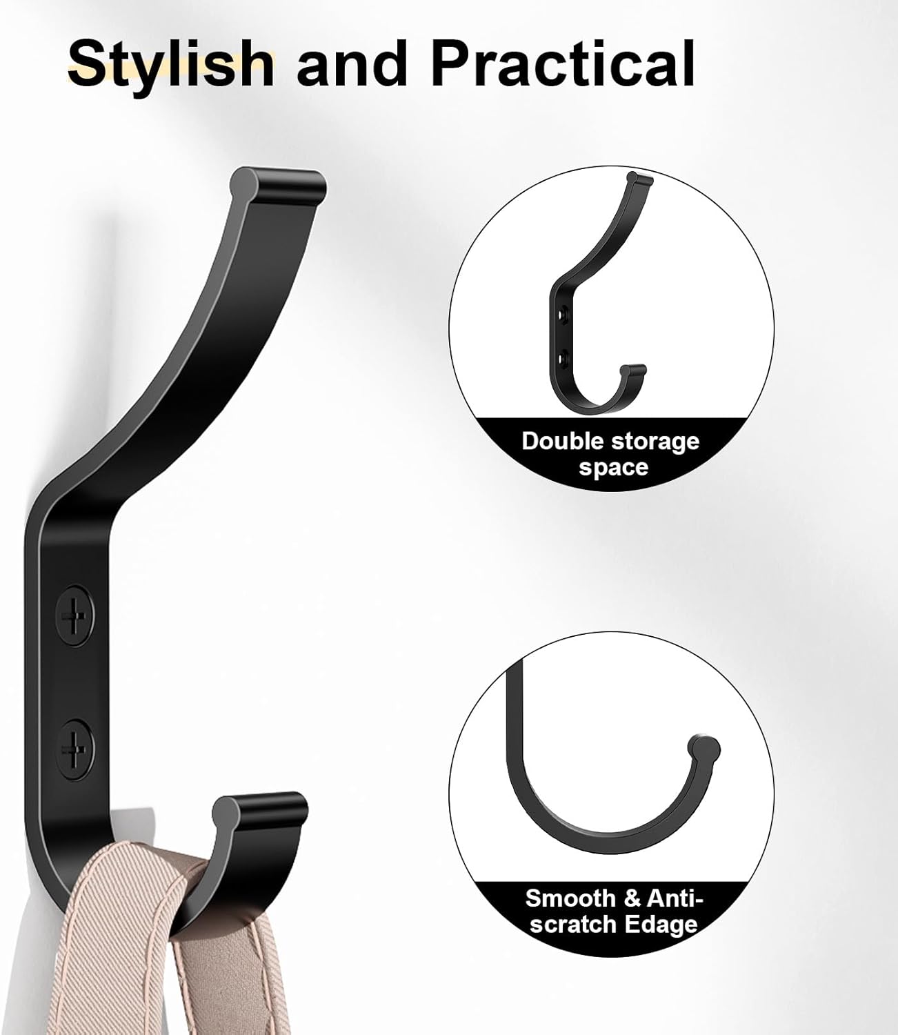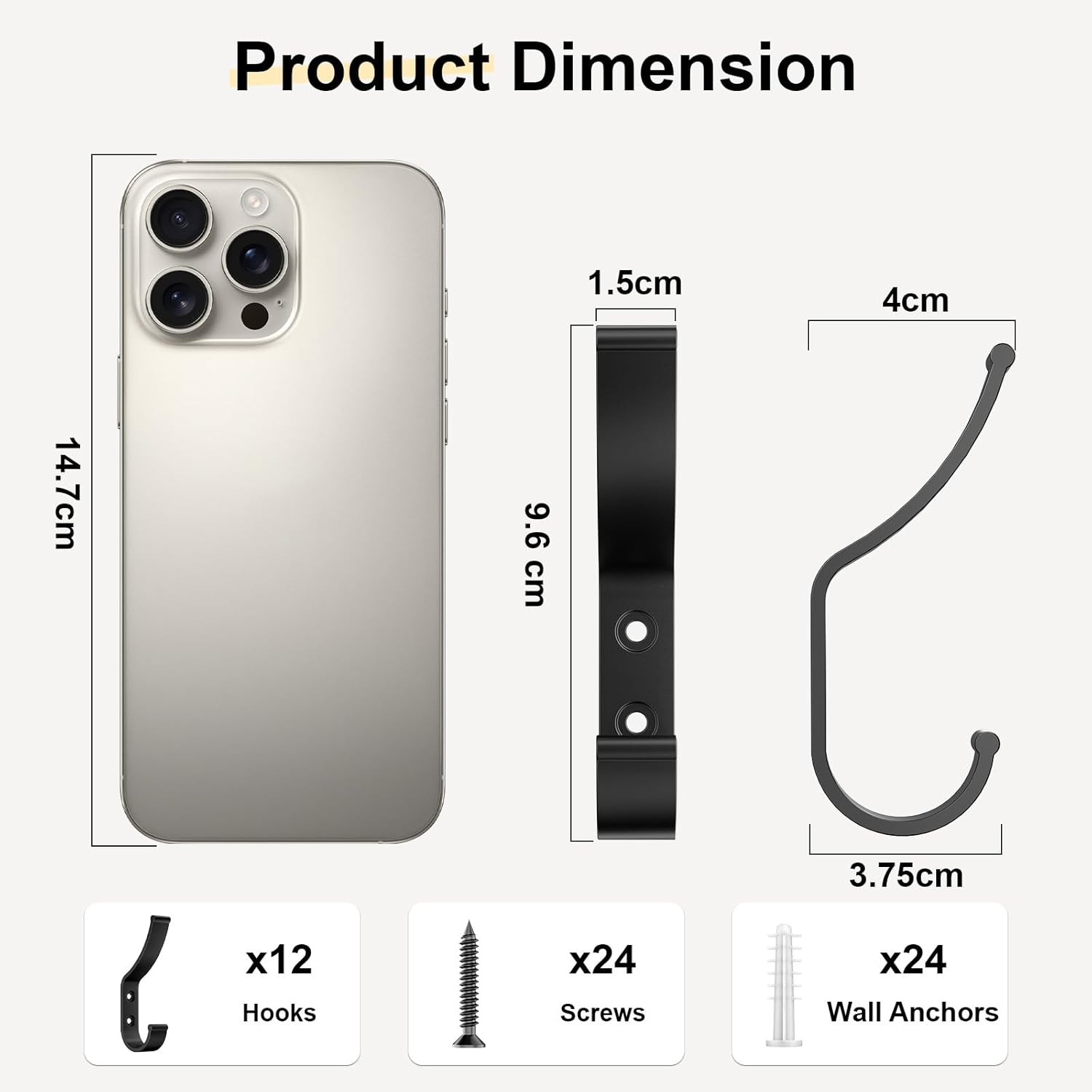 12 Pack Coat Hooks, 30KG Load Bearing Wall Hook for Hanging(Max), 1.6" L X 0.5" W X 3.94" H Coat Rack Wall Mount Double Hooks for Bag, Towels, Hats, Keys, Black