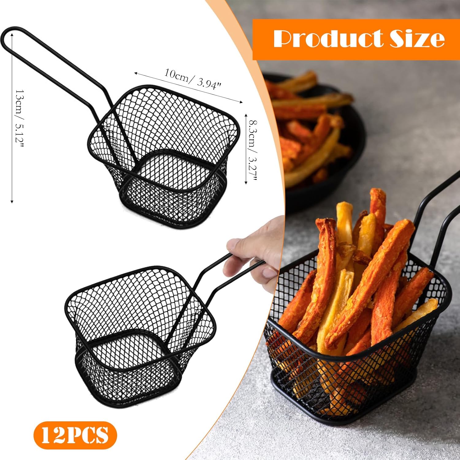 12 Pcs Mini Square Fry Basket Bulk Stainless Steel French Fry Holder Food Baskets for Serving Fryer Container with Handle Reusable Small Deep Fryer Holder for Home Kitchen Decor (Black)