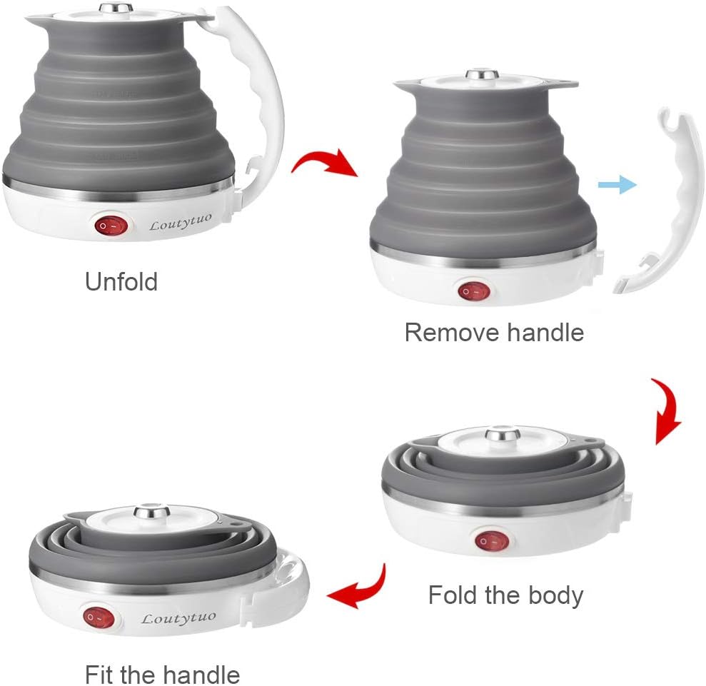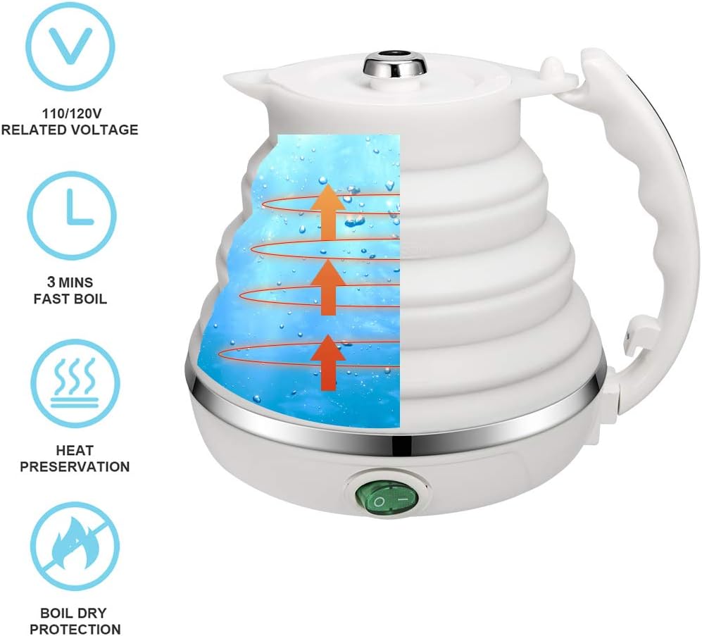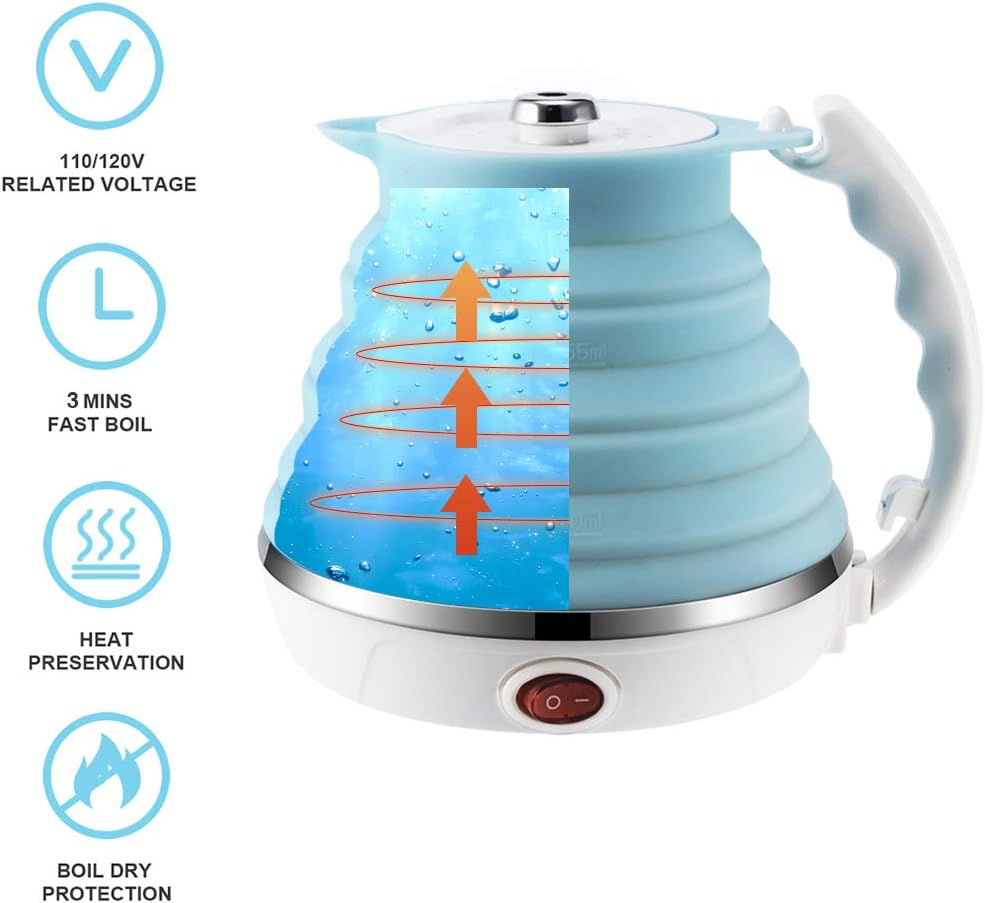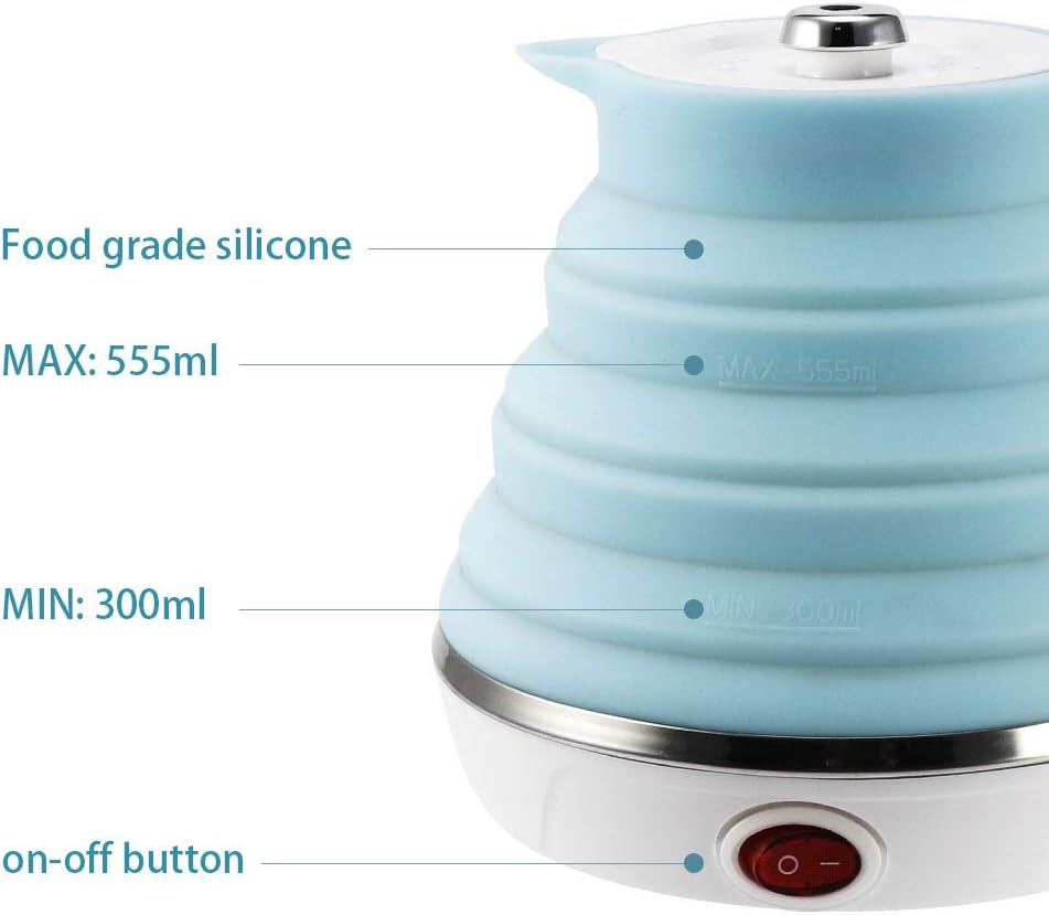 120V 555ML Ultrathin Travel Foldable Electric Kettle with Separable Power Cord and Handle, Boil Dry Protection, Food Grade Silicone