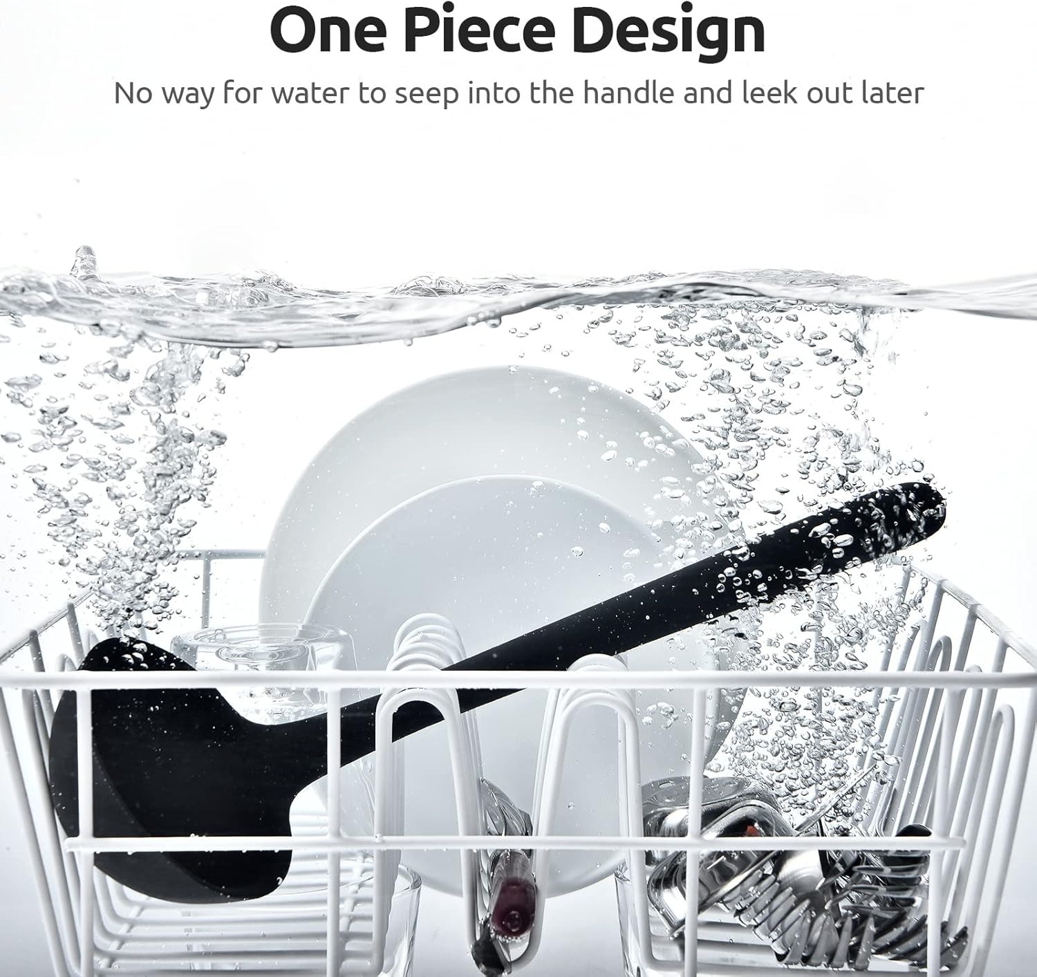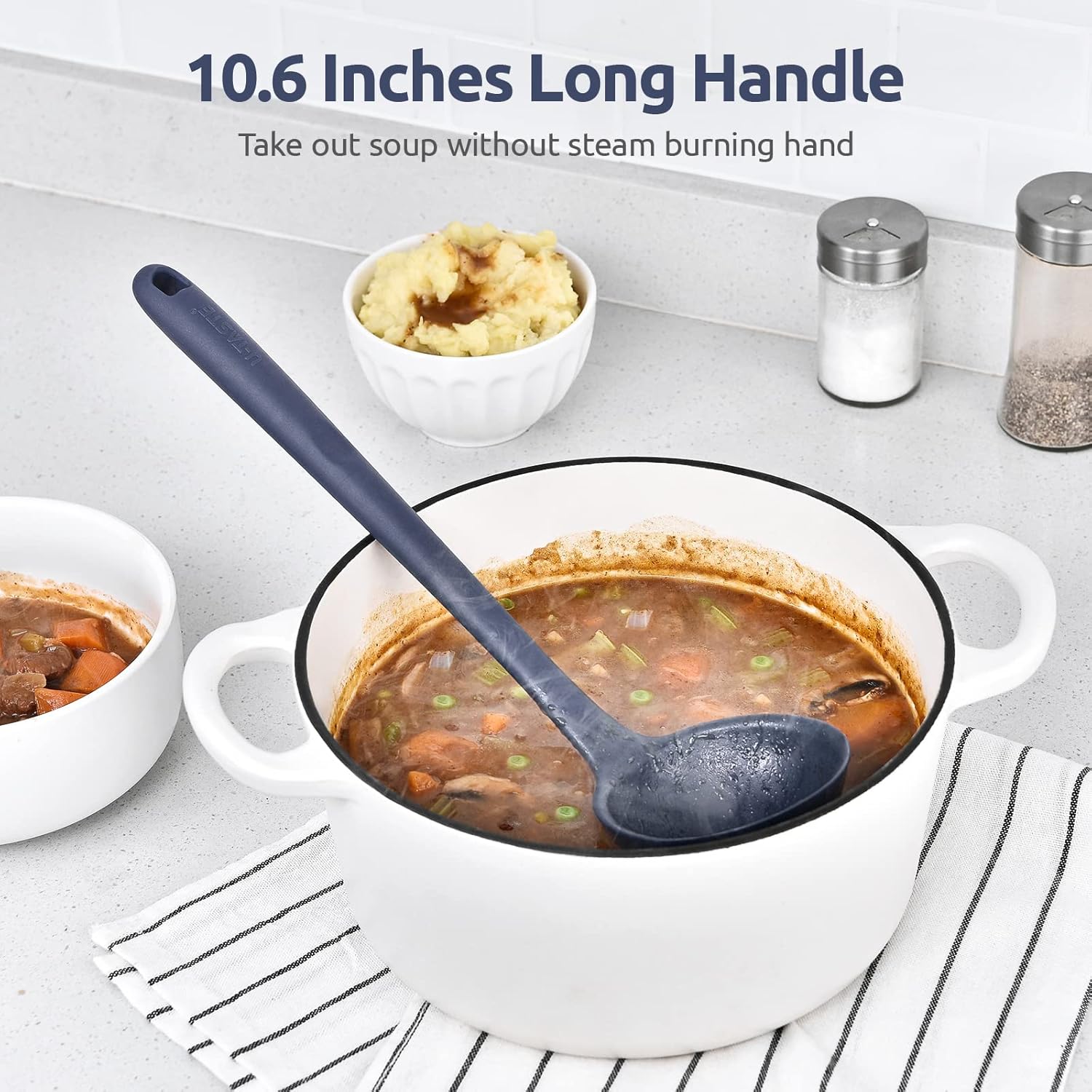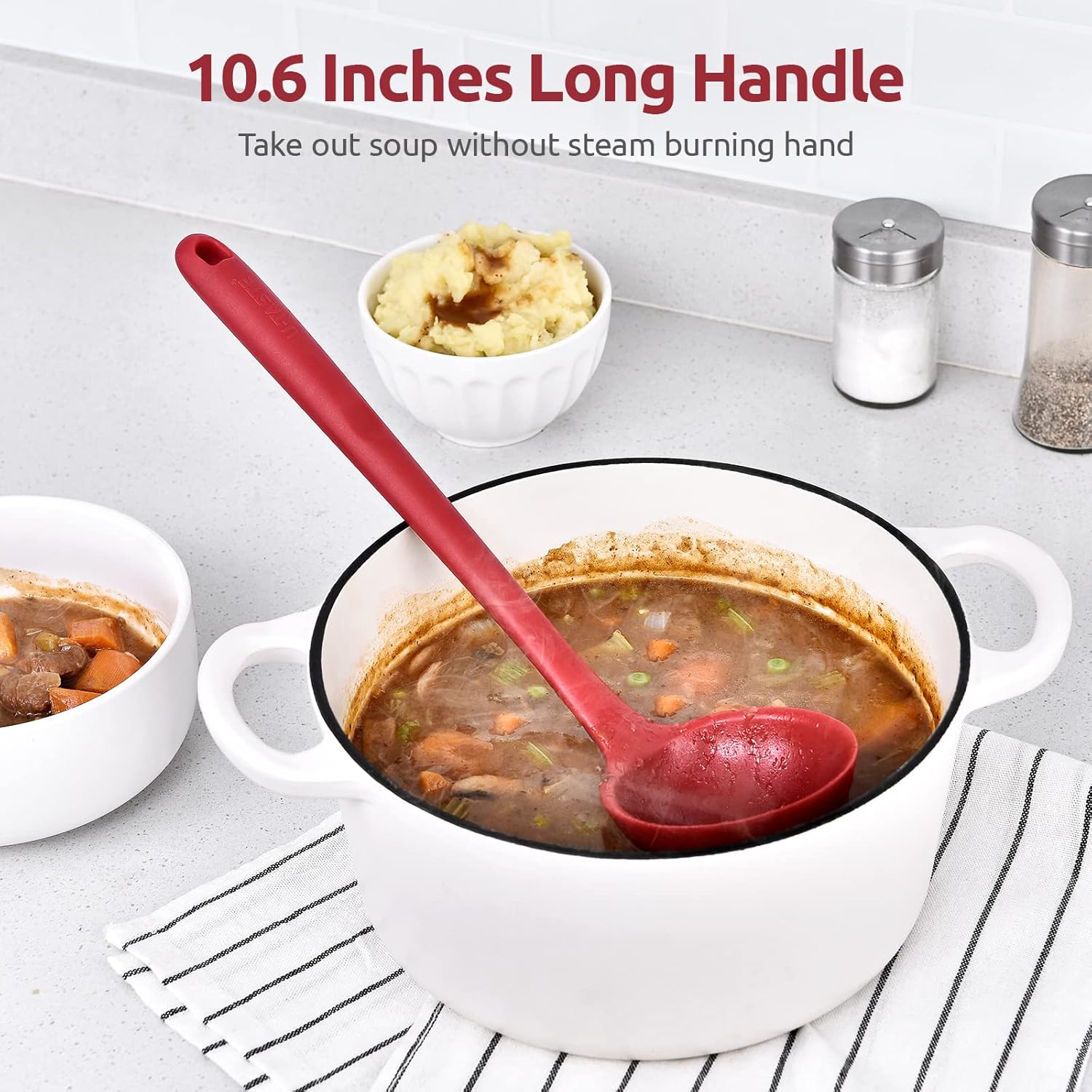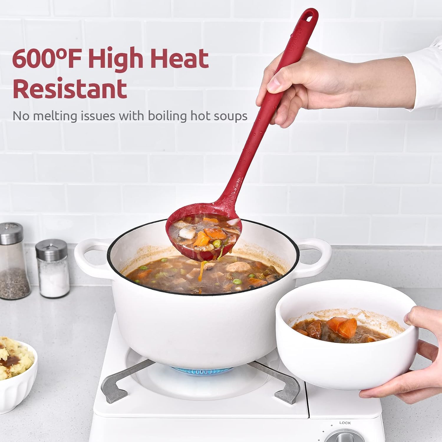 - [600ºF High Heat Resistant] It's made of food grade silicone and handles high heat well. If you forget and leave this kitchen ladle inside a pot of soup while you're eating dinner, it won't melt. You can use this cooking ladle for soups, thick chili, stews, gravy and other foodstuffs and it won't scratch your nonstick pots and pans. Integrated design makes it no small places for food to hide in! Goes through the dishwasher well or it's an easy, quick cleanup in the sink.