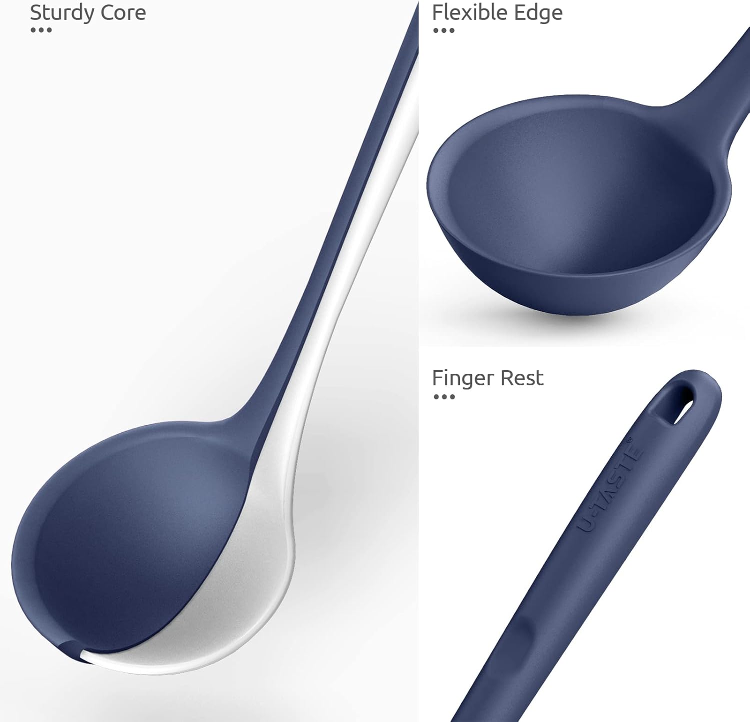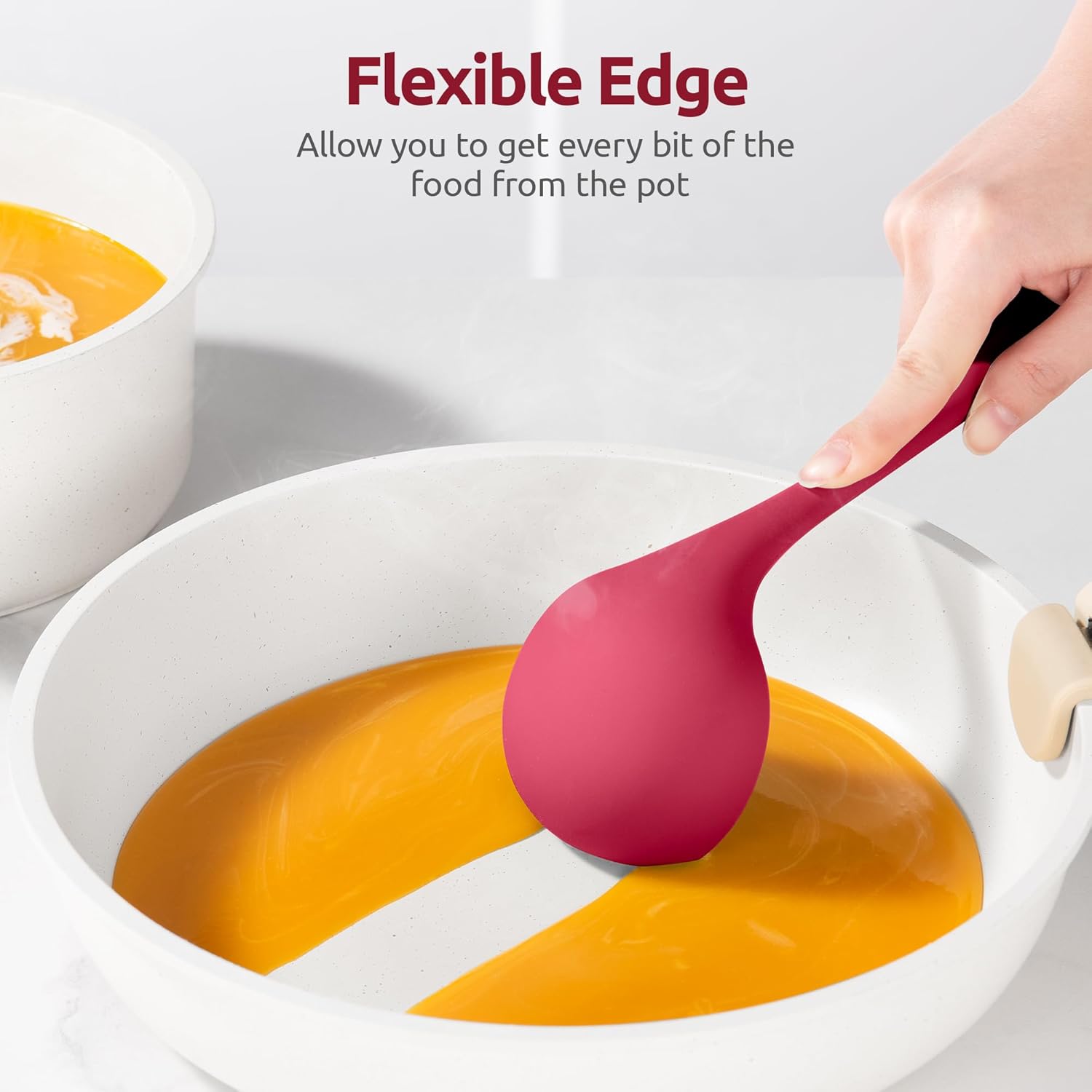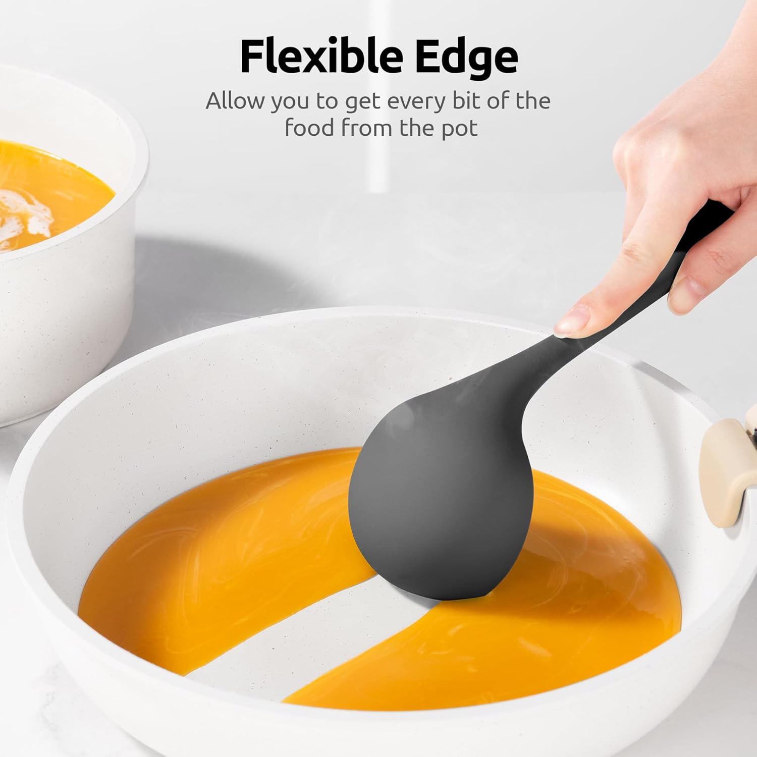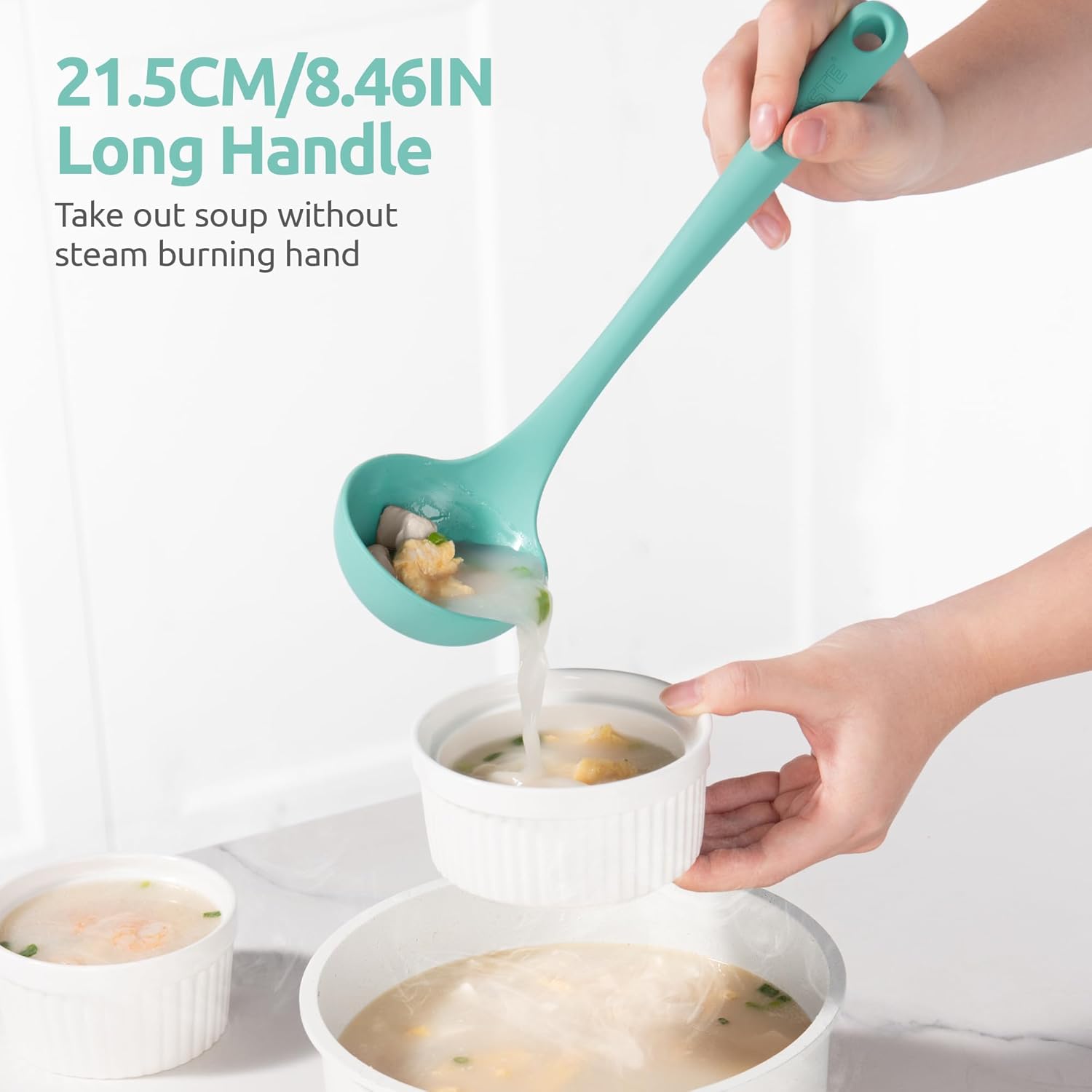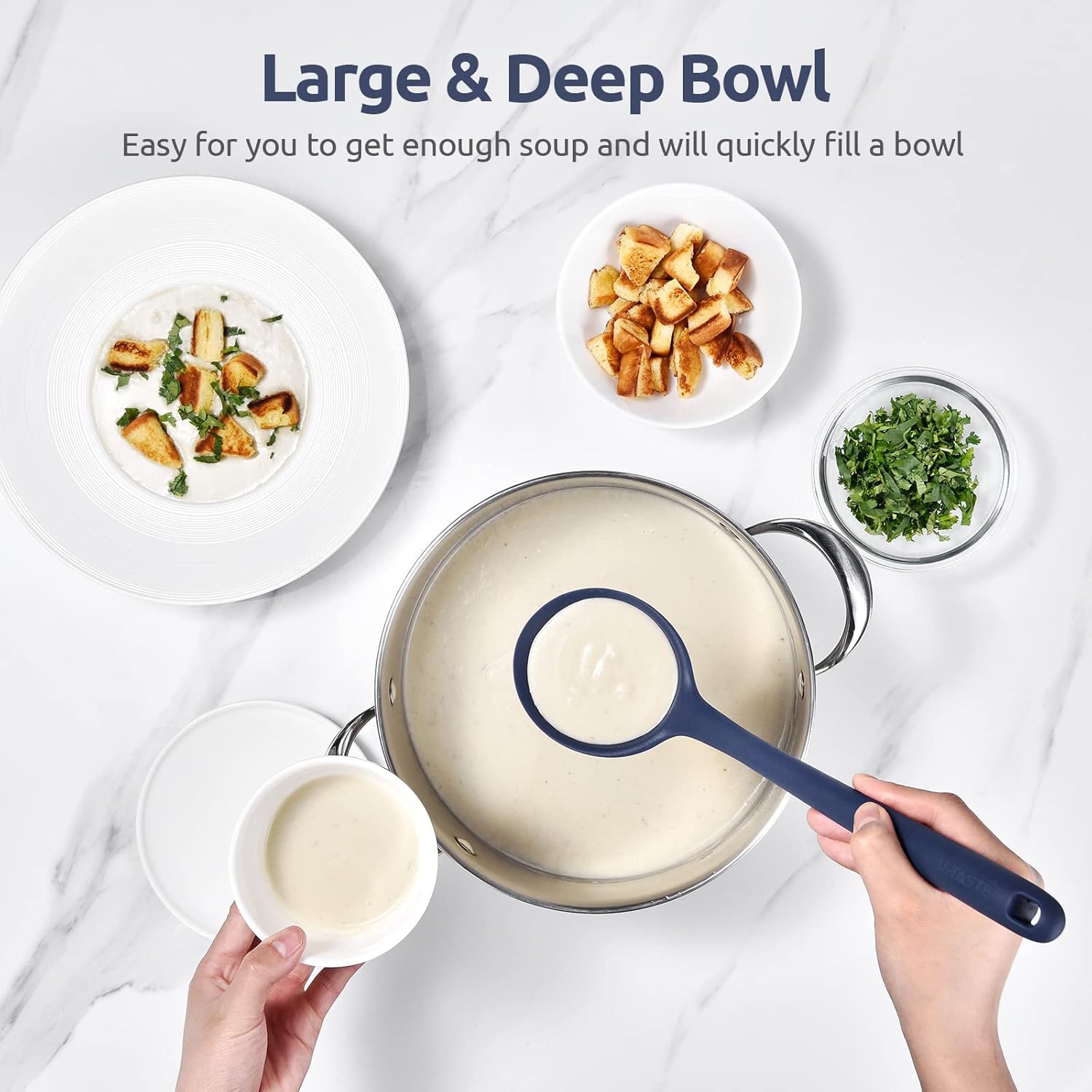 - [600ºF High Heat Resistant] It's made of food grade silicone and handles high heat well. If you forget and leave this kitchen ladle inside a pot of soup while you're eating dinner, it won't melt. You can use this cooking ladle for soups, thick chili, stews, gravy and other foodstuffs and it won't scratch your nonstick pots and pans. Integrated design makes it no small places for food to hide in! Goes through the dishwasher well or it's an easy, quick cleanup in the sink.