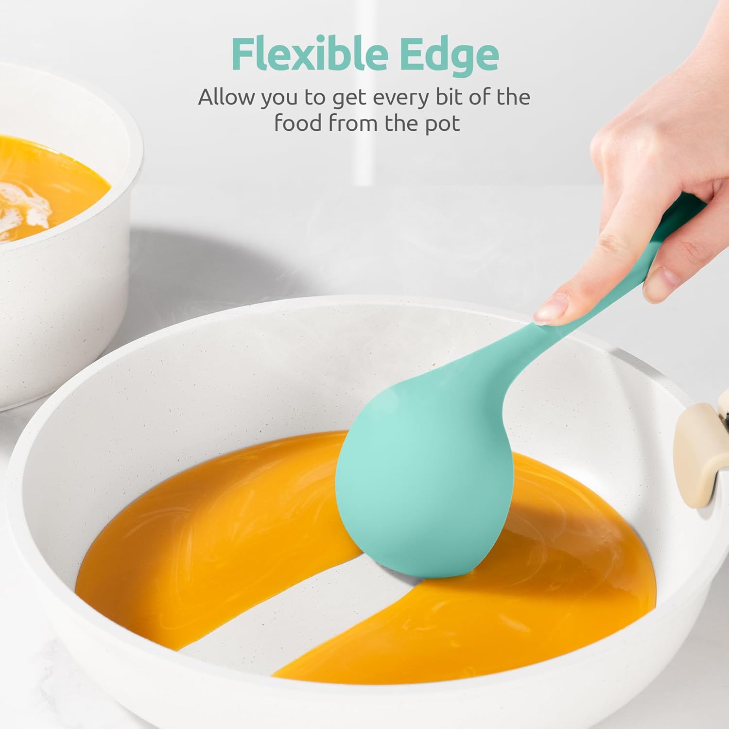 - [3.07in Diameter and 1.38in Deep Bowl] The large and deep spoon head makes the rubber ladle easy for you to get enough soup and will quickly fill a bowl without spills or too many drips. The best part is that the edges of the ladle bowl work will be like a rubber spatula, flexible enough to conform to the pot walls, allowing you to get every bit of the food from the pot without having to grab a regular spoon to scrape things out.