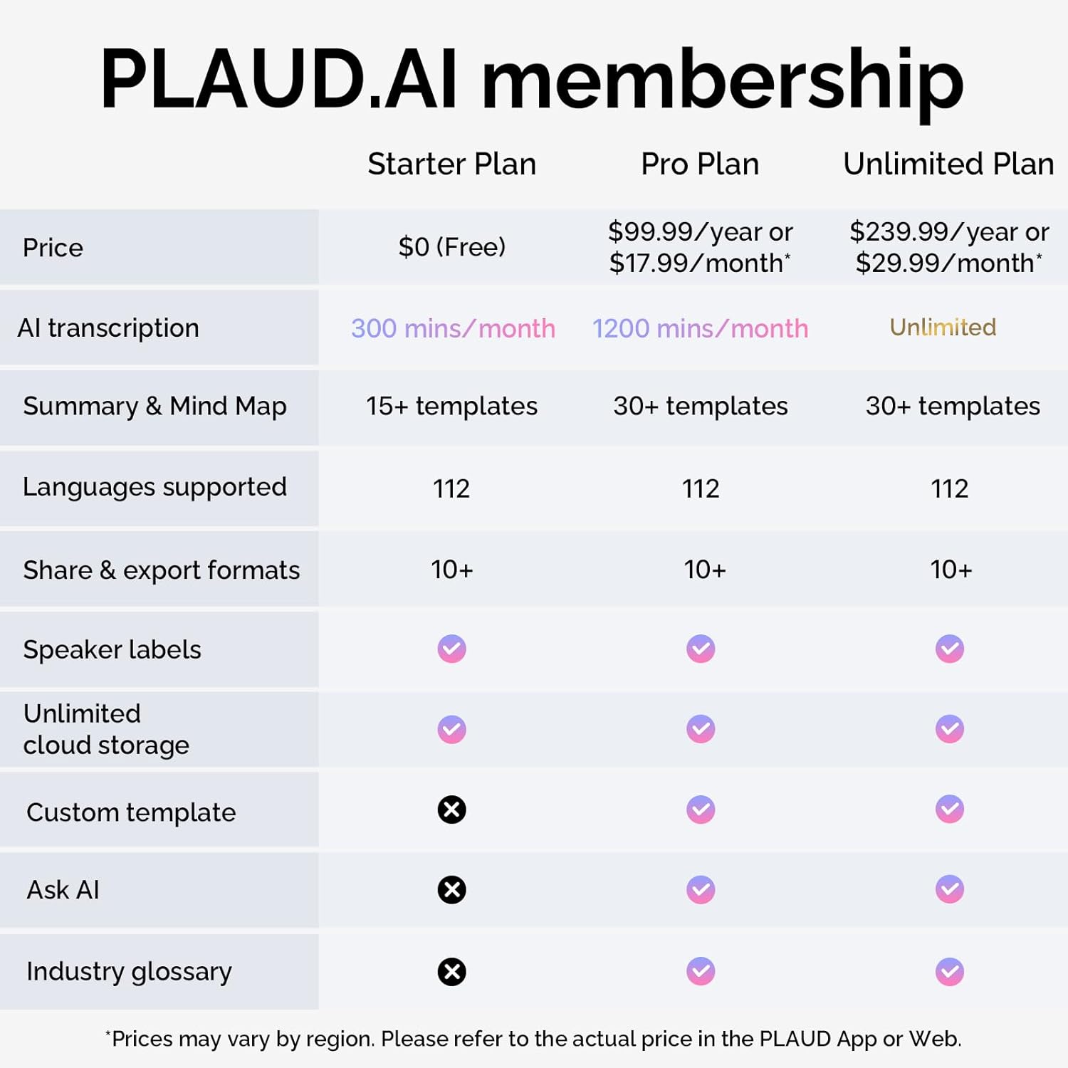 - NOTE: Activate your PLAUD NotePin to receive a free Starter Plan, including 300 minutes/month of AI transcription. Upgrade to the Pro Plan for CAD$139.99/year or CAD$19.99/month to unlock 1,200 transcription minutes per month, custom templates, and advanced features like Ask AI and AI suggestions.