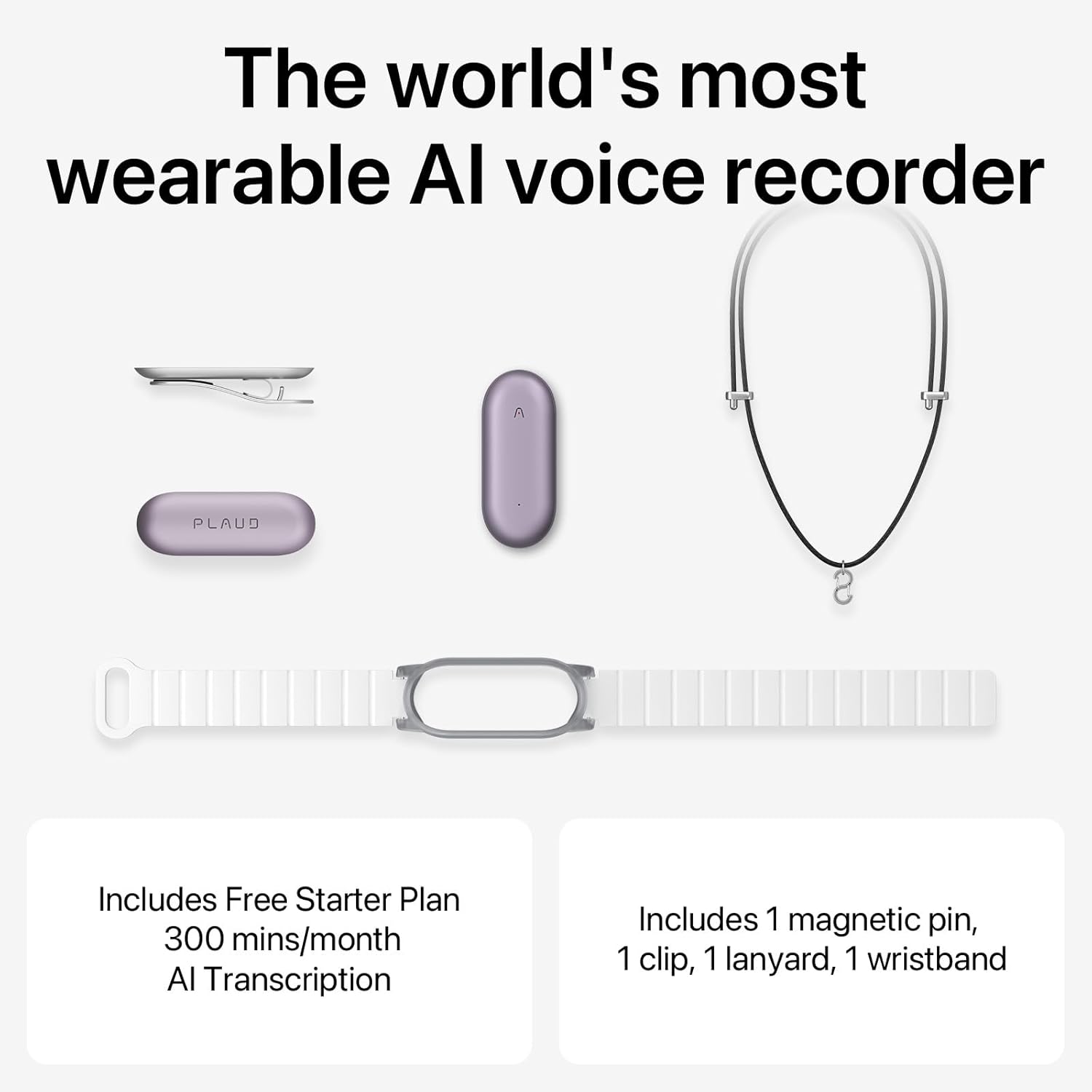 - EVERYTHING YOU NEED IS INCLUDED: 1 PLAUD NotePin Voice Recorder, 1 Black Lanyard, 1 White Wristband, 1 Silver Clip, 1 Charging Dock, and 1 USB-C Charging Cable. All PLAUD NotePin users enjoy a complimentary 300 mins/month for AI transcription.