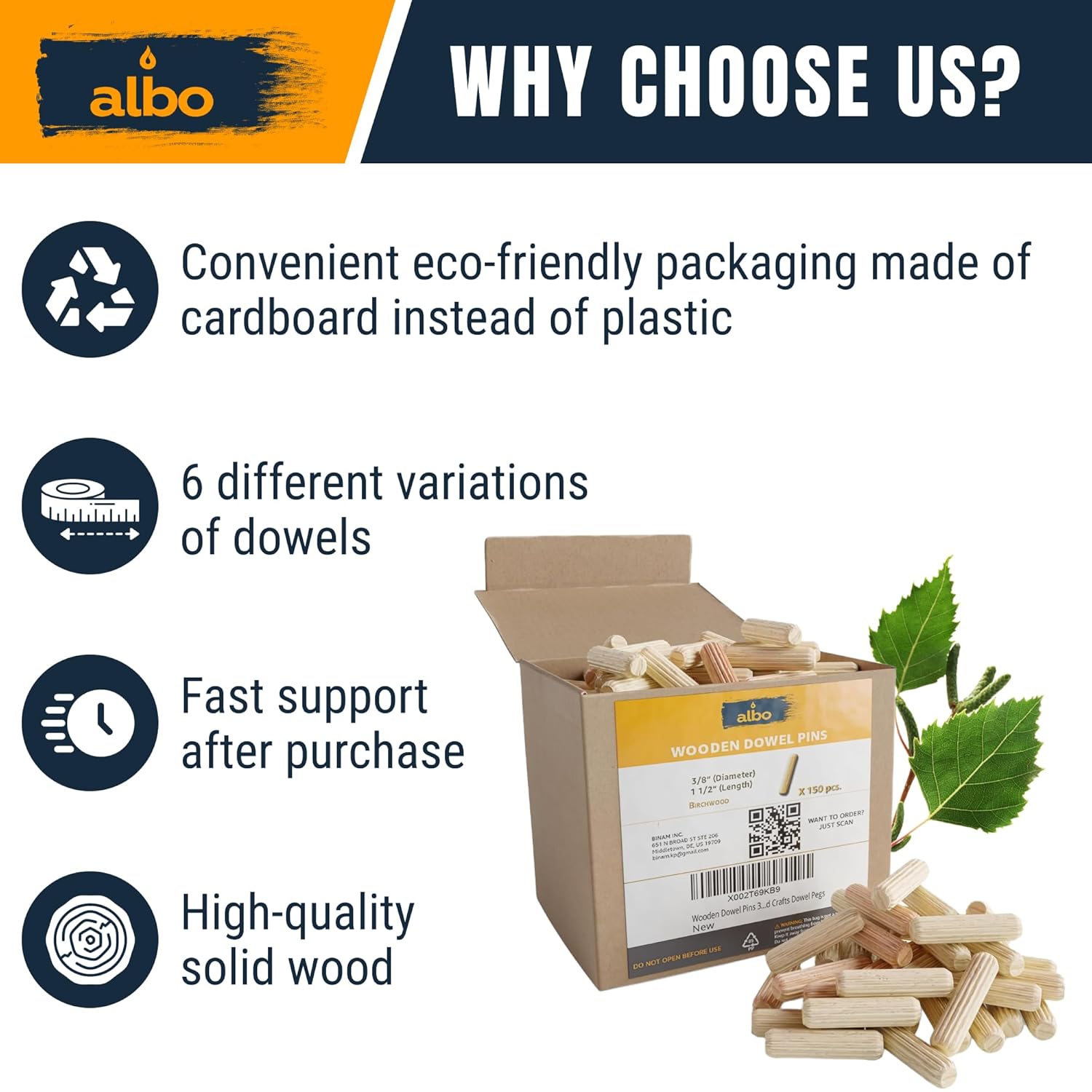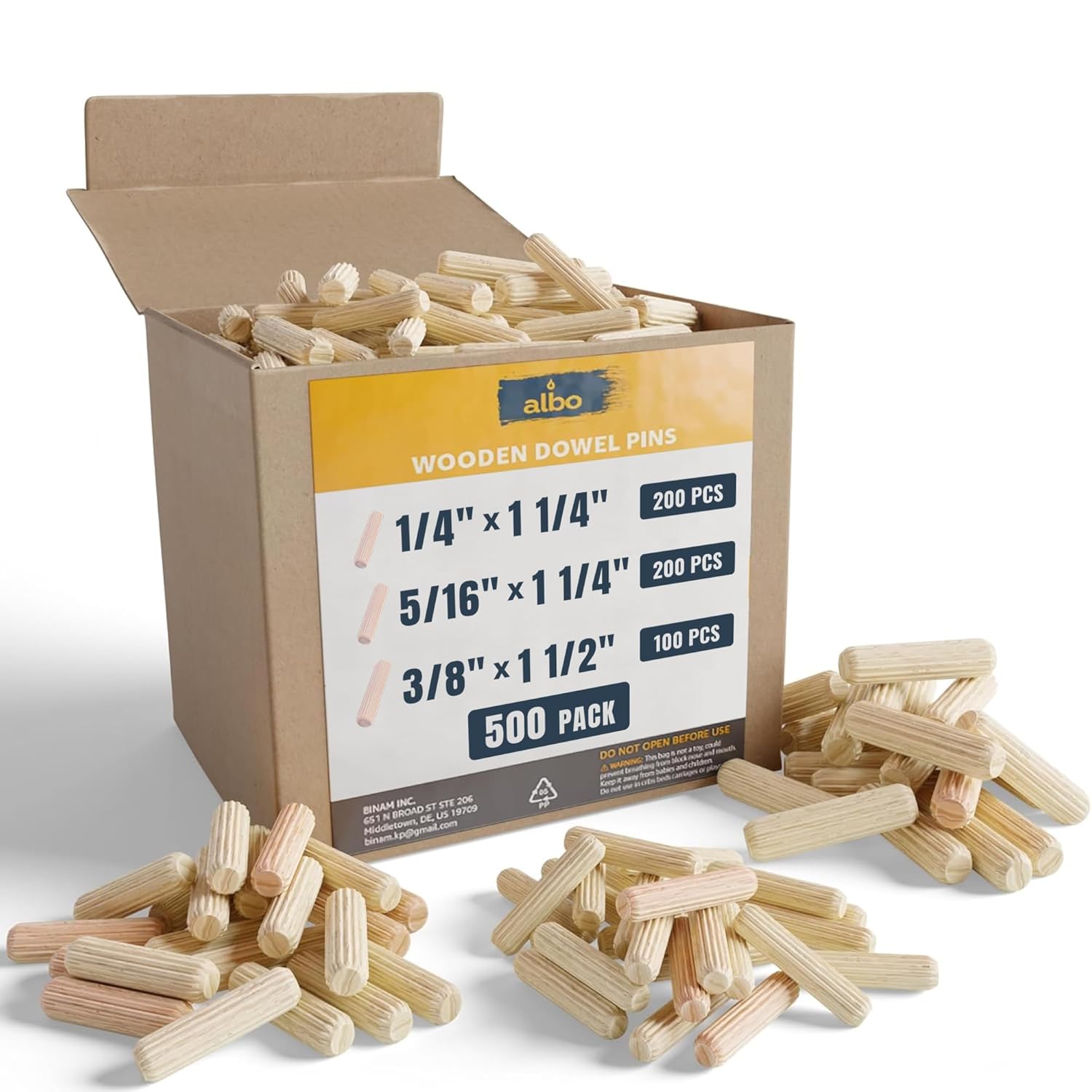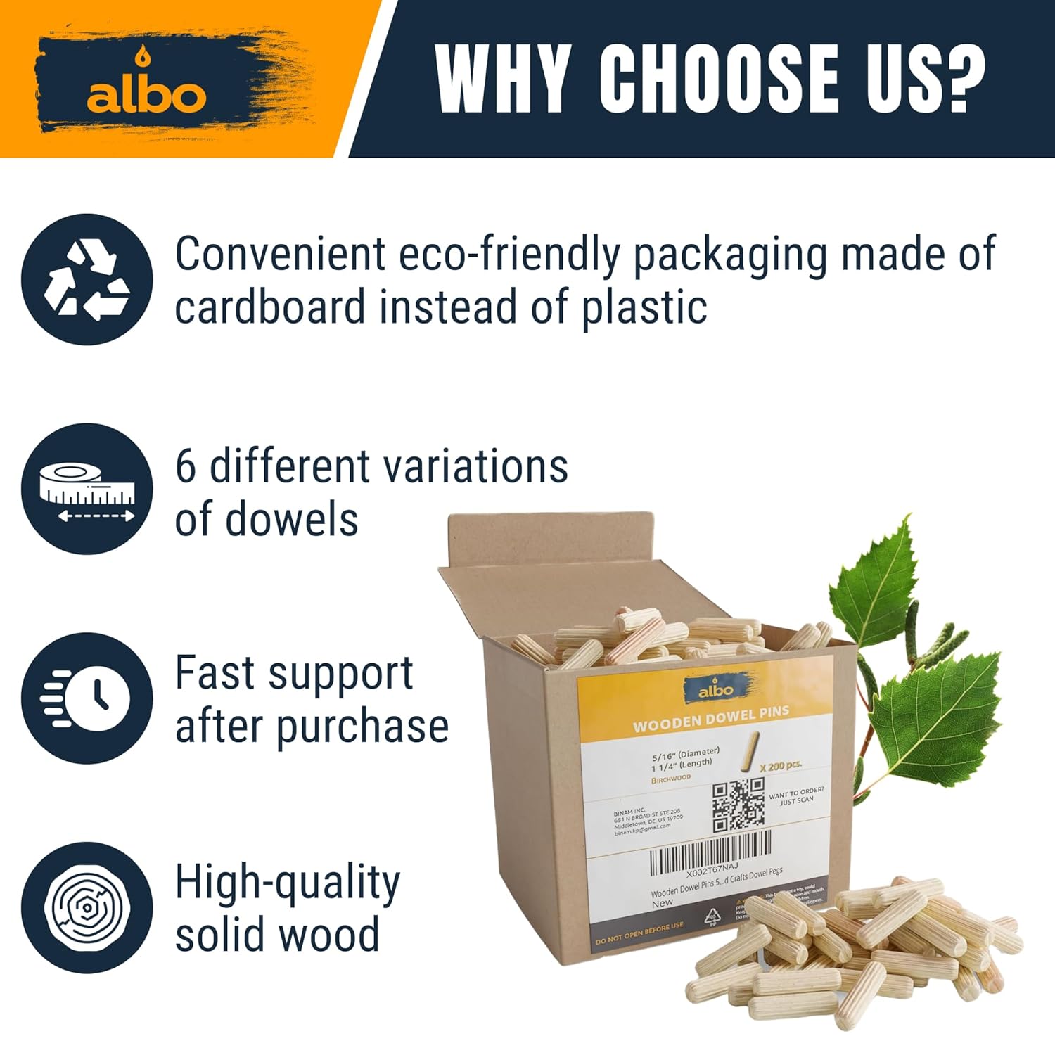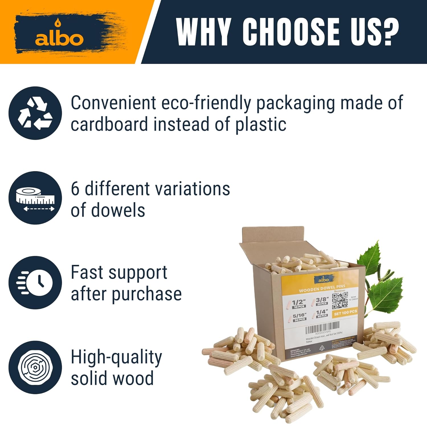 ALBO Wooden Dowel Pins 100 Pack Assorted Sizes 1/2 + 3/8 + 5/16 + 1/4 inch Fluted Wood Dowels Rods Hardwood Crafts Dowel Pegs