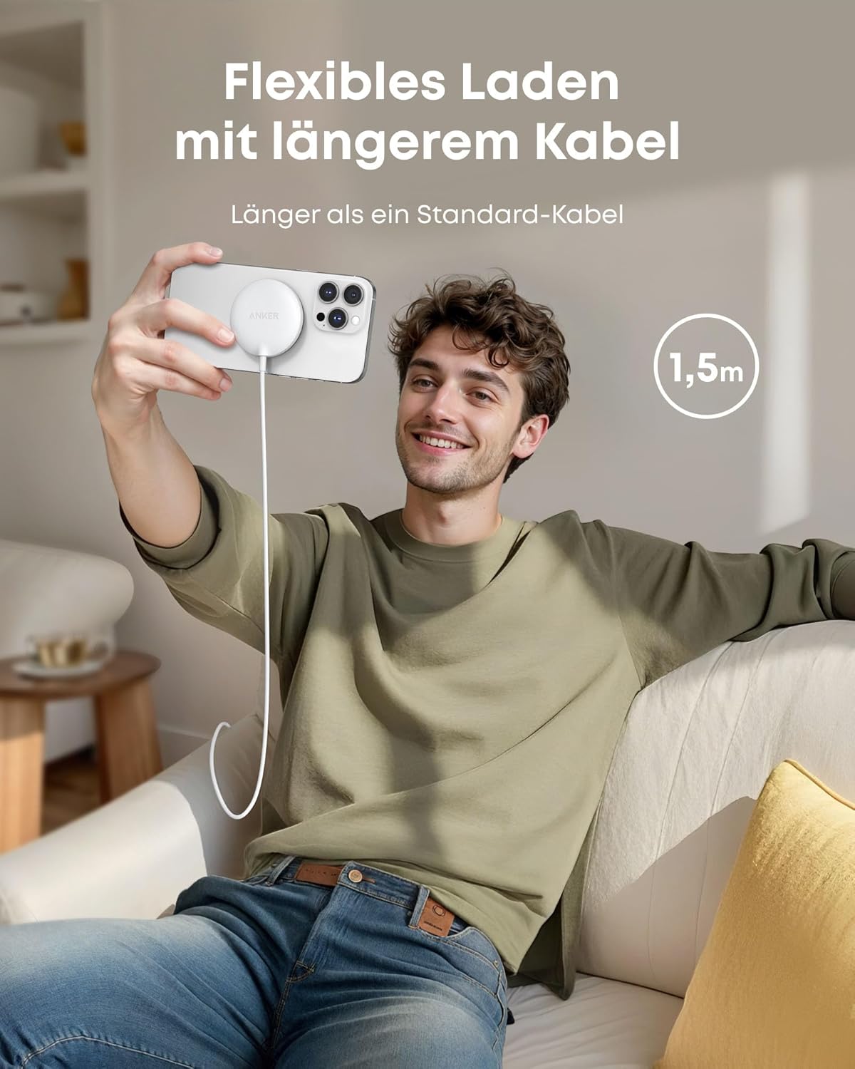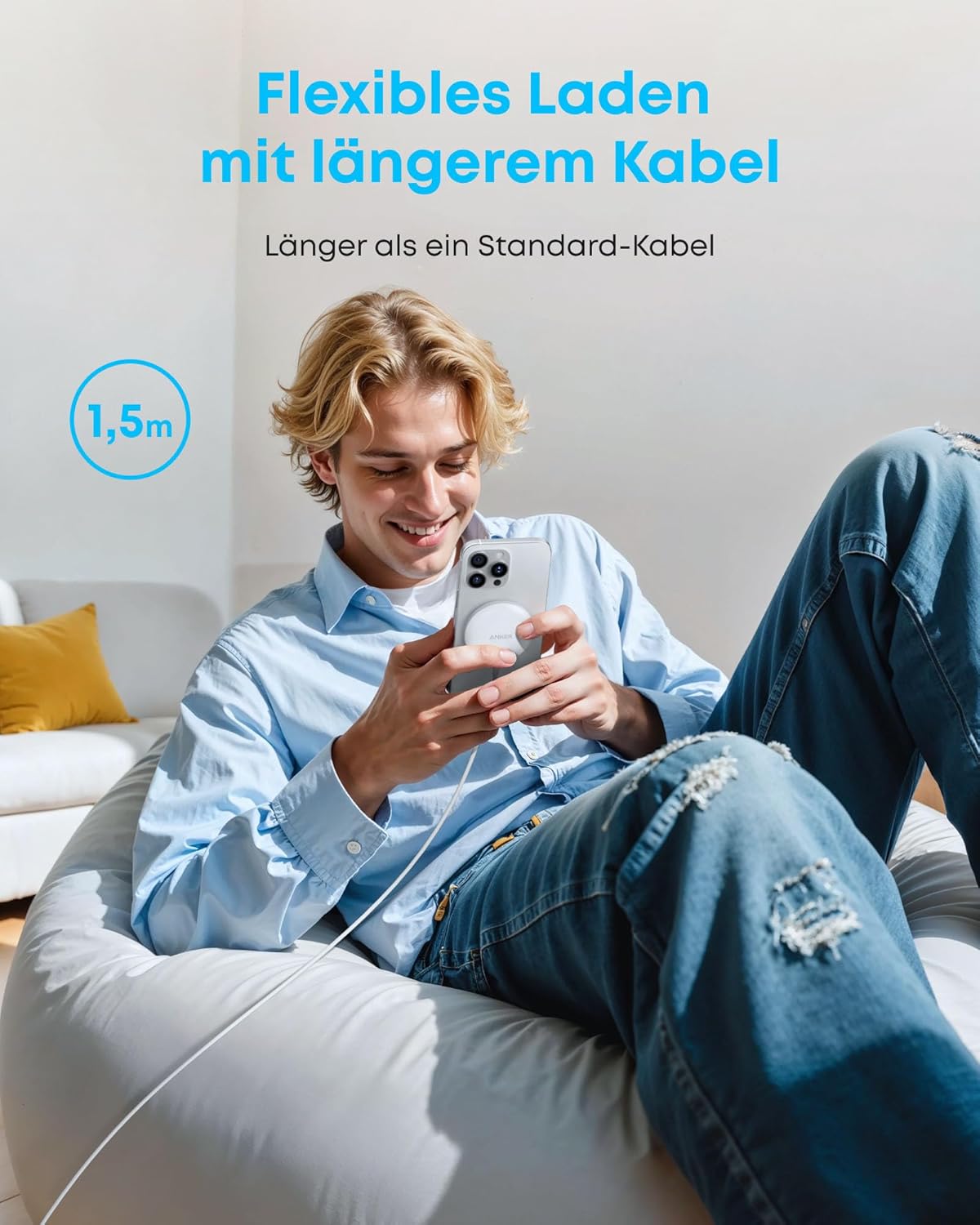 Anker Zolo Magnetic Wireless Charger, Qi2 Certified 15W MagSafe-Compatible Wireless Charging Pad with 5 ft Built-In USB-C cable, For iPhone 16/15/14/13 Series, AirPods, and More (Adapter Not Included)