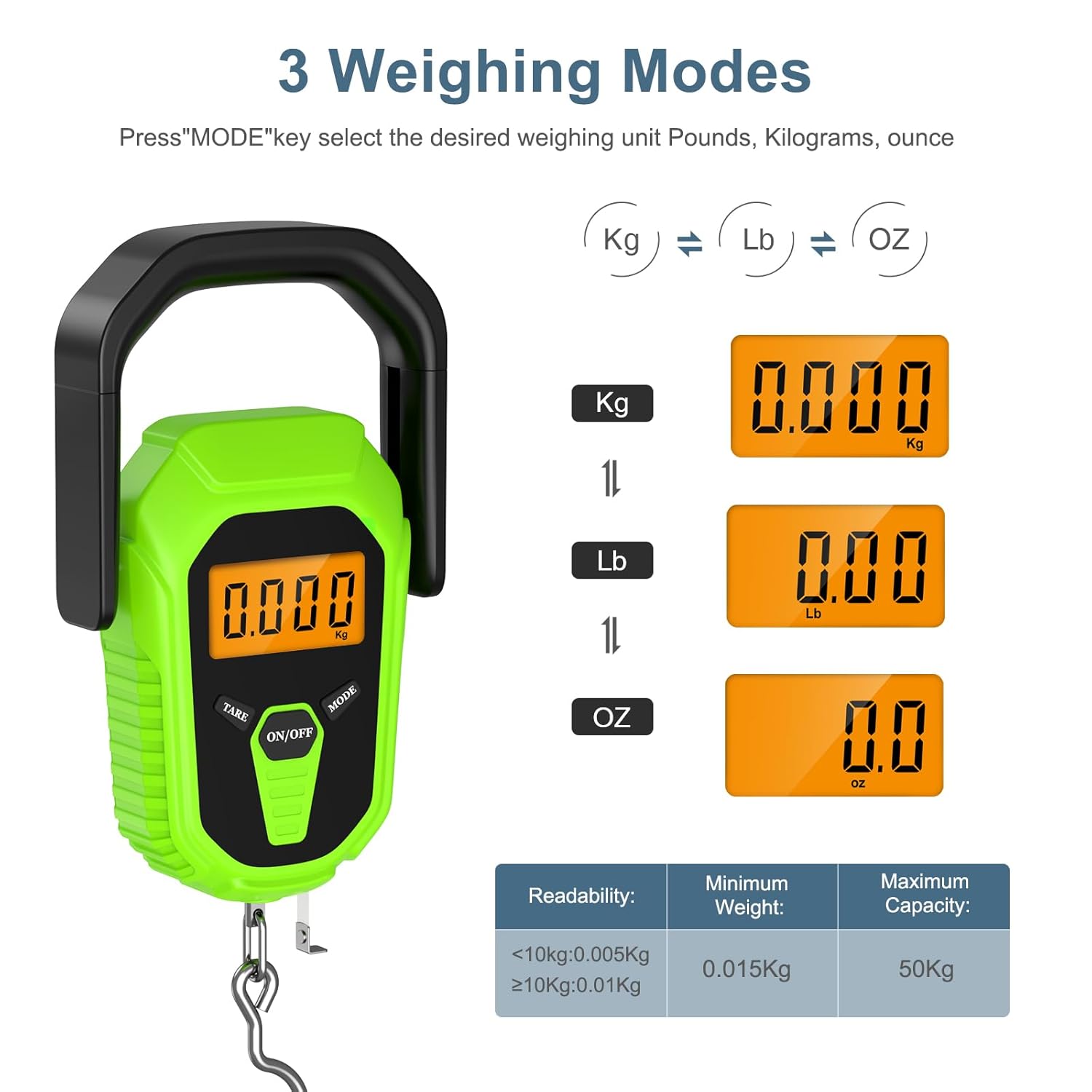 Precision Sensor for Swift Weighing: This fishing scale features a high-precision sensor that ensures accurate weighing with a rapid response time of approximately 2 seconds. It offers versatility with measurement units in Kg, Lb, and oz, covering a range from 15g to 50kg/ 0.03lb-110lb. With high sensitivity and minimal error values, can meet the customer's various weight measurement needs.
