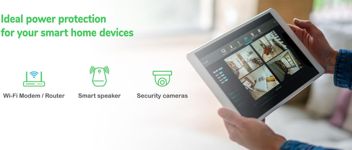 Automatic Voltage Regulation (AVR), Surge-protected 1 Gb dataline ports, 5' Power Cord with right-angle wall plug (NEMA 15-15P)