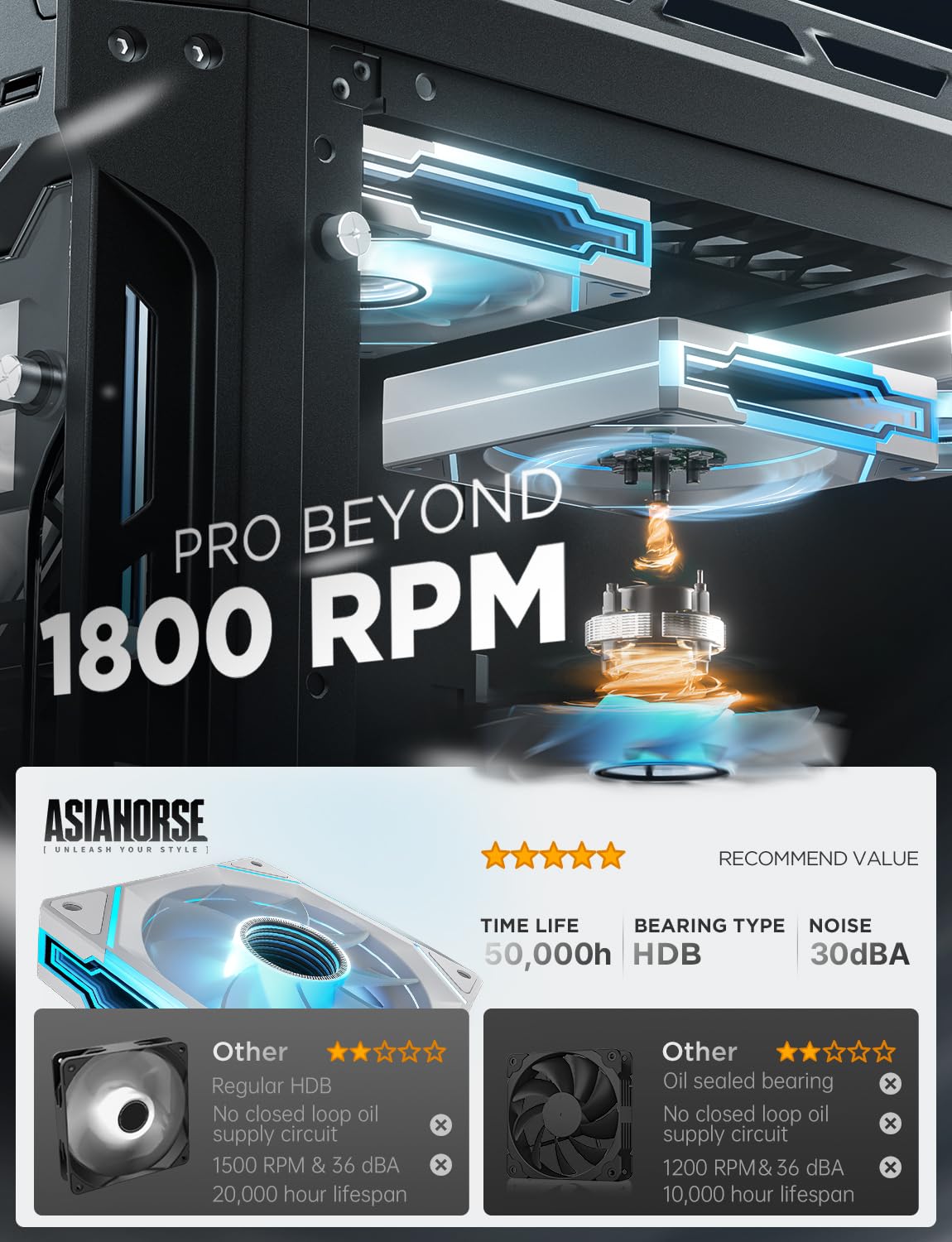 Exceptional Cooling Performance: AsiaHorse rgb case fans boasts an airflow rate of 61.5 CFM and a wind pressure of 2.0mmH2O, achieving efficient heat dissipation at 1800 RPM. This rgb pc fans ideal for high-intensity tasks, ensuring stable and high-performance cooling