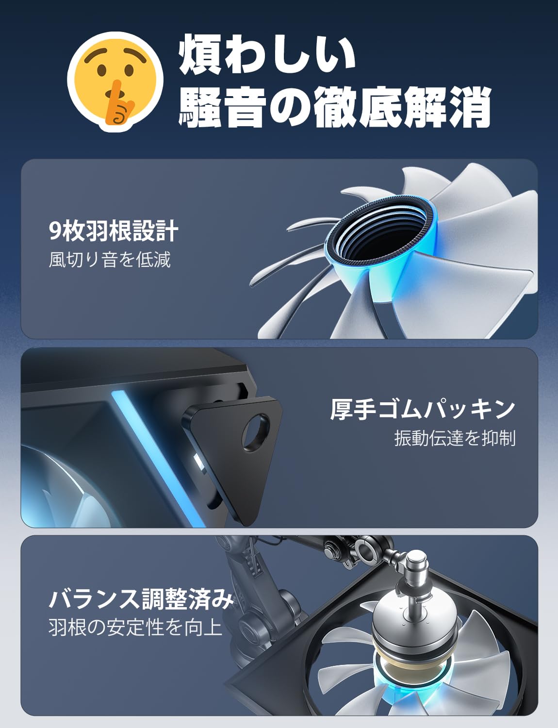 Unique Noise Reduction Design: The 120MM fan features a low noise level of just 30dB(A). Its 9-blade design and high-quality plastic material minimize wind noise, while rubber pads and balancing adjustments further reduce noise, creating a peaceful environment